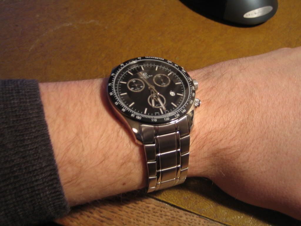 Thats what initially attracted me to the idea of a C7 (I don't have the best part of £1400 to blow on a watch). I heard that they were going to release a Valjoux 7750 model soon which I was going to hold out for however after trying on a few 42mm watches I decided that my girls wrists really can't handle a face that big.Great looking watch arryb, and thans for posting some pics. 100 times better than any on the CW site. FThe official pics are fine if you like super closeup artsy-fartsy stuff but IMHO if you want your customers to pull their wallets out then show them what the whole watch looks like, not just a little bit of it.