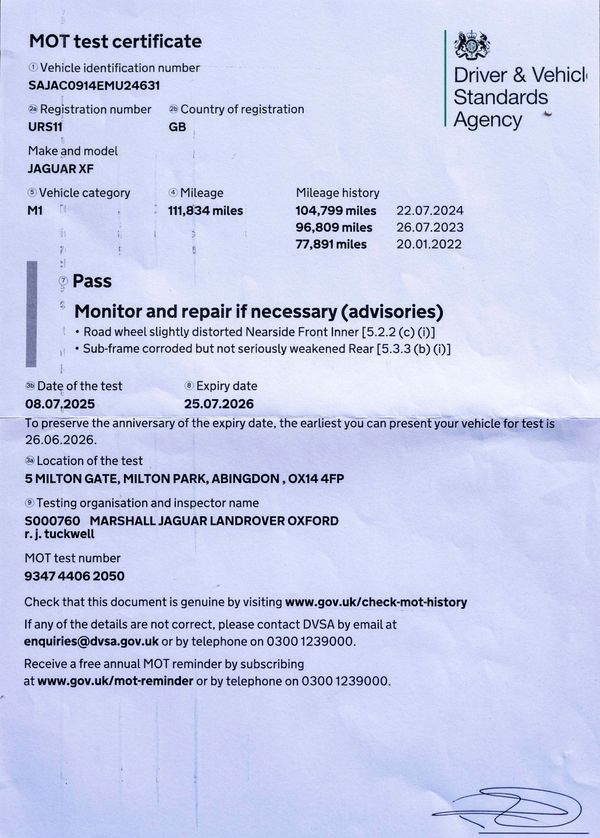 MOT until July 25th 2026