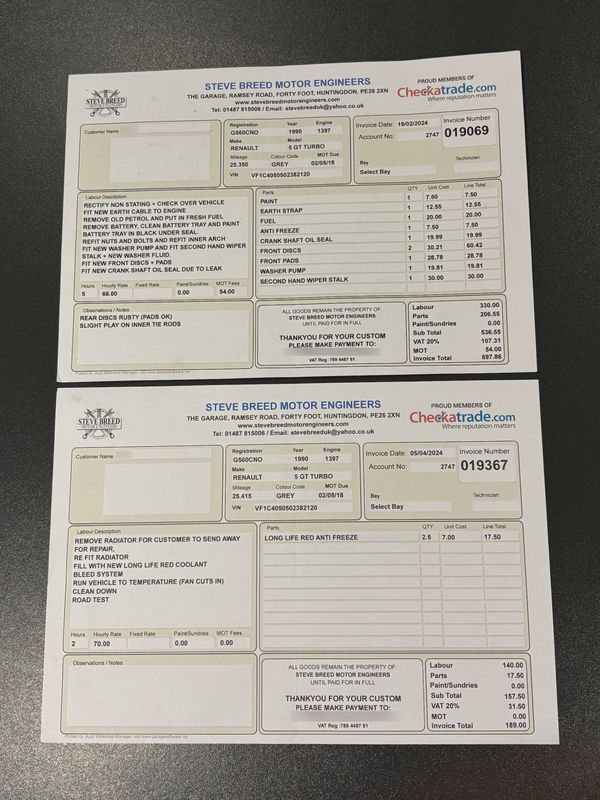 In 2015 the offside front wheel bearing was replaced, and a major service inc brake fluid change was carried out by Smiths Renault of Peterborough @ 24,598 miles