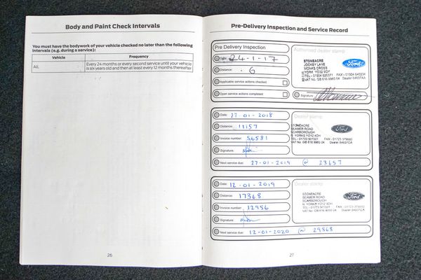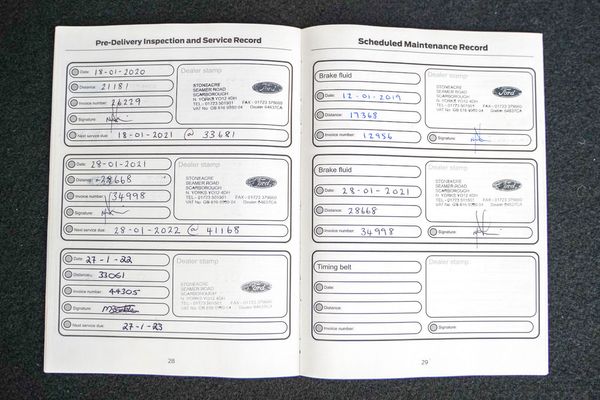 Stamped service book with services as follows: January 2018 @ 11,157 miles, January 2019 @ 17,368 miles; January 2020 @ 21,181 miles; January 2021 @ 28,668 miles; January 2022 @ 33,061 miles; January 2023 @ 39,248 miles; February 2024 @ 39,617 miles