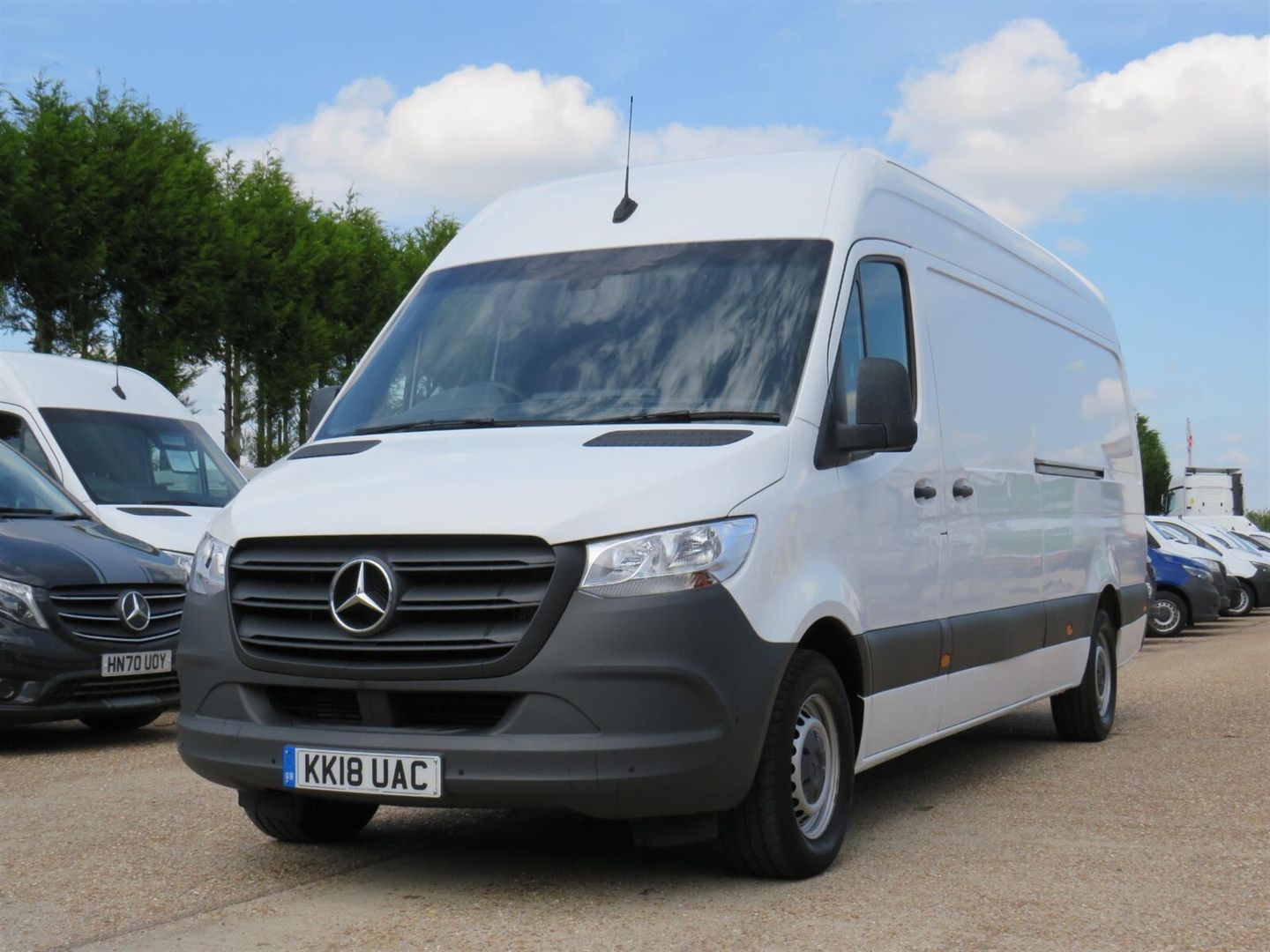 Axle ratio i = 3-923, Active Brake Assist, Multifunction steering wheel, Stabilisation level I, Height and rake adjustable steering wheel, High roof H2, Full-length partition, Hill-Start Assist, MBConnect - 5, Digital radio (DAB), USB socket- 5 V , Preinstallation for switch panel, MBUX multimedia system with 7-inch touch screen, heavy-duty battery, Preinstallations electrical system- PSM, Terminal strip for electrical connection, Starting aid contact, Mercedes-Benz emergency call system, Breakdown management, Shelf above windscreen, Hinged lid for stowage compartment, Stowage compartment underneath cockpit, Anti-theft protection package, Double Lock, ECO Gear 360 6-speed manual transmission, Heat-insulating glass w.band filter on windscreen, Model series C907 / C910 Sprinter, Model series C907 VS30 RWD, Standard, Basic, Complete vehicle, Right-hand drive, Wheelbase 4325 mm- overhang 1615 mm, 3-5 tonner, Speedometer- mph and km/h, Seat belt warning for driver's seat, Temperature indicator, Crosswind Assist, Communication module (LTE) for digital services, ATTENTION ASSIST, Fuel filter with water separator, Lights for left hand traffic, Interior light(s)- load/pass. comp. wi. door cont., Omission parking lamp, Headlight assistant, Side marker lights, 3rd brake light, Comfort overhead control panel, Adaptive brake light, Alternator 14 V / 180 A, OM 651 DE 22 LA engine 105 kW (143 hp) at 3800 rpm, Emissions category Euro 6c N1 GR.III/N2, Cruise control, Longitudinal member reinforcement, Spare wheel bracket below frame end, Spare wheel, Tyres without name of make, Tyres 235/65 R16 C, Summer tyres, Tyres- resistance-optimised, Steel wheels 6.5 J x 16, Driver's seat, Co-driver's seat double seat, Airbag- front driver's seat, Sliding door left, Grab handle-at load comp.sliding door on partition, Wood flooring, Fabric Maturin black, Rear doors- double-wing- opening to side wall, Plates / booklets english, VIN visible from outside, COC EUTA complete, without load uprating/derating 3500 kg, Model generation 0, Hydraulic Jack, Qualification N1, National version for EU - EFTA, Production in Düsseldorf, Panel van, duplication code for factory types