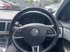 12V socket in rear of vehicle, 17" Ursa alloy wheels, 2 X front 12v power sockets, 3 rear seat head restraints, 3 spoke leather steering wheel, 7" colour screen, ABS+EBA, Alarm/immobiliser, Alloy space saver spare wheel, Anti-whiplash front headrests, Approach lamps, Automatic headlights, Auxiliary heater, Auxiliary input socket, Bi-Xenon headlights with LED day running lights, Bluetooth audio streaming, Bluetooth telephone connectivity, Body coloured bumpers, Bond Grain leather instrument panel and door top rolls, Bond Grain leather/suede cloth upholstery, Brake pad warning light, Bright window surrounds, Chrome grille, Cornering brake control, DAB digital radio module, Deadlocks, Drive away door locking, Driver information centre, Driver/Front Passenger airbags, Drivers footrest, DSC - Dynamic Stability Control, Dual zone climate control, Electric adjustable heated door mirrors, Electric front/rear windows with one touch/auto up/down, Electronic parking brake, Folding rear centre armest, Front armrest, Front centre console storage box, Front/rear seatbelt pre-tensioners, Headlight washers, Intelligent high beam, Interior mood lighting, Isofix child seat preparation, Jaguar 600W premium sound system with CD + 11 speakers, Jaguar sense, JaguarDrive selector, Keyless Start, Media interface, Metallic - Rhodium silver, Parking aid pack - XF, Rain sensor windscreen wipers, Reach/rake electric adjustable steering column + entry/exit tilt away, Rear parking sensor, Remote central locking, Service interval indicator, Servotronic PAS, Side airbags, Side curtain airbags, Steering wheel gearshift paddles, Steering wheel mounted audio/cruise controls, Three 3 point rear seatbelts, Trip computer with dual function, Twin front cupholders, Twin rear cupholders, Tyre pressure monitoring system