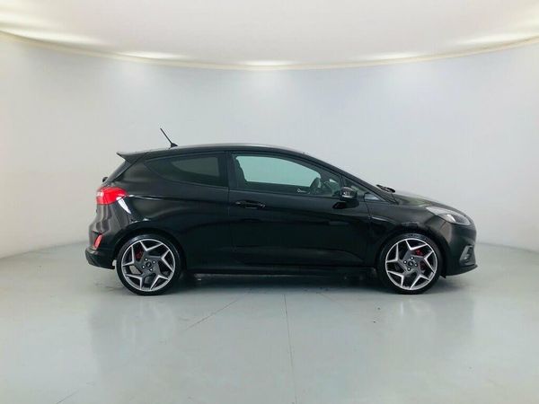 Ford SYNC 3 Navigation system incl 8" touchscreen, 7 speakers, FordPass connect, Apple carplay, android auto, voice control and emergency assistance, 17" Matt black machined alloy wheels, Bluetooth system, DAB Digital radio, Cruise control with active speed limiter, 2 USB ports, 3 point seatbelts on all rear seats, 3 spoke flat bottomed leather steering wheel with blue stitching, 60/40 split folding rear seat, ABS+EBA, Adjustable head restraints, Auxiliary input socket, Black headlining, Body coloured bumpers, Body coloured door handles, Body coloured electrically operated and heated door mirrors with side indicators, Body coloured large rear spoiler, Boot carpet, Centre console with opening armrest, 2x cupholders, 12v and USB, Chrome inner door handles, Cornering front fog lights, Curtain airbags, Driver and passenger airbags, Drivers knee airbag, Dual chrome exhaust tailpipe, Electric front windows/one touch facility, Electric power steering, Electronic stability control with hill start assist, Footwell illumination, Ford easy fuel, Front map reading lights, Front passenger airbag deactivation, Front seatback pockets, Front side airbags, Illuminated glovebox, Keyless start with 'Ford Power' starter button, Leather gaiter, Leather handbrake lever with blue stitching, LED Night signature to rear lights, Load area light, Manual 2 way passenger seat adjust, Manual 4-way driver seat adjust, Manual air conditioning, MyKey system, NCAP Pack - Fiesta, Overhead console with sunglasses holder, Pollen filter, Quickclear heated windscreen, Rain sensing wipers and auto dimming rear view mirror, Rake/reach adjustable steering wheel, Rear parking distance sensors, Rear privacy glass, Rear wiper, Recaro cloth upholstery, Remote central locking & engine immobiliser, Seat belts with blue detailing, Seatbelt warning, Selectable drive modes (Normal, Sport, Track), Steering wheel mounted controls, Thatcham Cat.1 alarm, Trip computer, Two tone horn, Tyre pressure monitoring system, Unique ST front grille, Unique ST gearknob with blue stitched gaiter bag, Unique ST rear bumper with diffuser, Unique ST scuff plates, Unique ST suspension