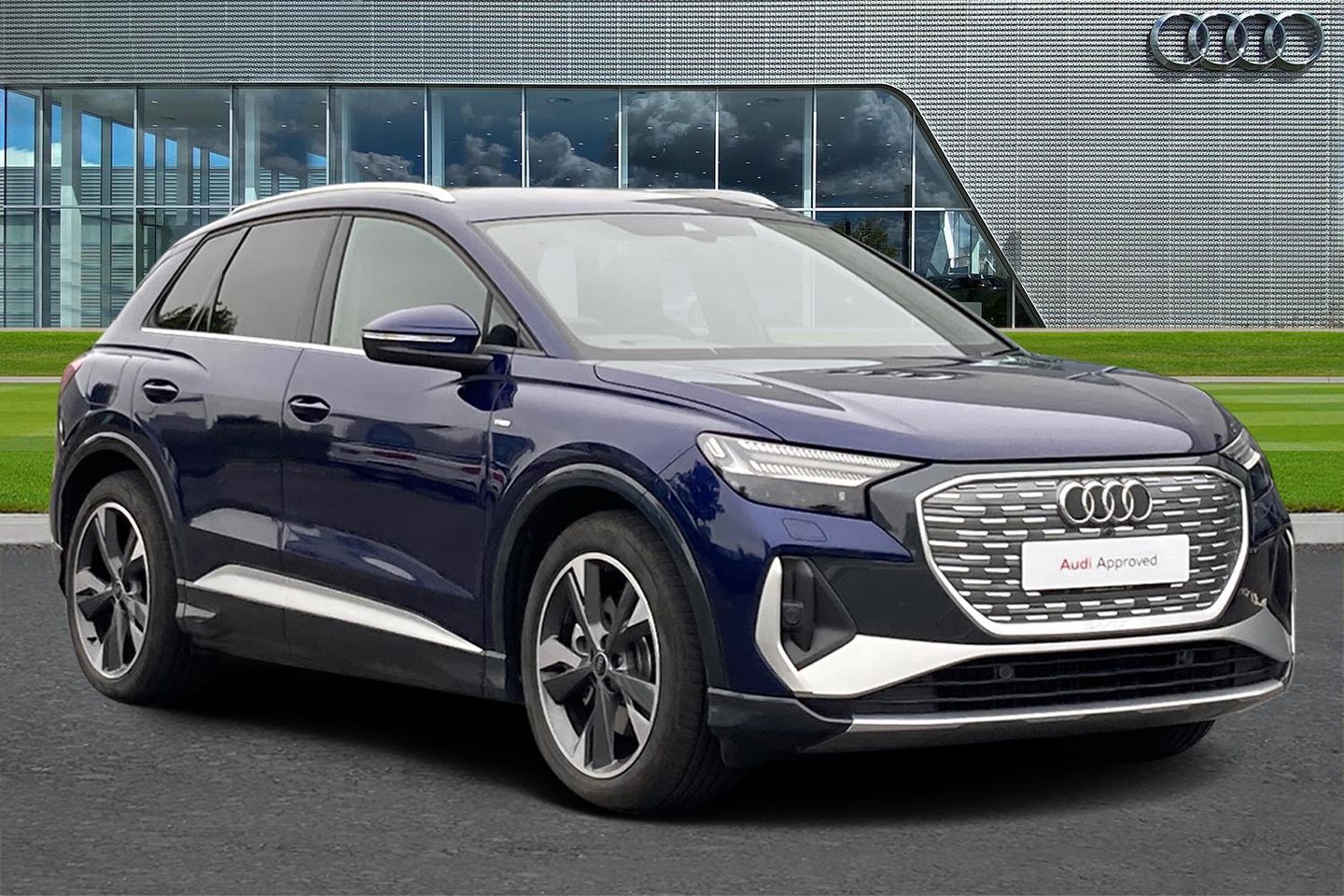 11KW onboard charger, Audi connect safety and service (e-call), Audi drive select, Audi Smartphone Interface with wireless functionality, Bluetooth interface, Camera based traffic sign recognition, Cruise control + speed limiter, Lane departure warning system, MMI Navigation Plus with high resolution 10.1 inch touchscreen colour display, Power operated tailgate, Progressive steering, Rear parking sensors, Swerve assist and turn assist, 125kW DC charging capability, AC and DC charging access point positioned on the rear right, Sports suspension with 15mm lower, DAB Digital radio, Rear 12V socket and 2 x USB-C connections for charging devices, SONOS premium sound system with 10 speakers, Acoustic glass windscreen, Acoustic glazing for front door windows, Aluminium roof rails, Contrast bumpers in Manhattan grey, Driver's door mirror memory, Electrically adjustable/heated/folding/dimming door mirrors with kerb view includes integrated LED indications + kerb view function for passenger side, Frameless auto dimming interior rear view mirror, Headlight washers, LED daytime running lights, Matrix LED headlights, digital light signatures, dynamic light sequencing and indicators + LED rear lights and illuminated light strip, Projection light in the exterior mirrors, e-tron logo projected from the underside of the exterior mirror onto the ground, S line badges on front wings, S line exterior styling, Side and rear window privacy glass, Single frame grille with a structured, closed surface within an octagonal shape, 3 zone automatic air conditioning, 4 way electric lumbar support for driver and front passenger, Accent surfaces in gloss black - centre console control panel, switch panel and trim on front doors in gloss black, Auxiliary air conditioning, Black cloth headlining, Comfort front centre armrest, Compact e-tron charging system, Door armrests in leatherette, Driver/passenger manual seat height adjustment, Flat bottom twin spoke leather multifunction sport steering wheel with shift paddles for recuperation, Flat top and bottom twin spoke leather multifunction sport steering wheel with shift paddles for recuperation, Front and rear head restraints, Front door sill trims with aluminium inlay, illuminated with S logo, Front/rear floor mats, Heated front seats, Household plug type G (GB), Industry plug CEE 32 A/230 V/6 h/long + straight, Mode 3 AC charging cable 22 kW, Stainless steel pedals, Tool kit, Ambient lighting plus pack - Q4 E-tron, Function pack - Q4 E-tron, Gloss styling pack - Q4 E-tron, Interior pack - Twin leather - Q4 E-tron, Non smoking pack - Q4 E-tron, Technology pack - Q4 E-tron, 3x3 point rear seatbelts, Active vehicle alerting system (AVAS), Driver and front passenger airbag with passenger airbag deactivation, Electric child locks, Front side airbags with head airbags and interaction airbag, Pre-sense front with pedestrian and cyclist detection, Seatbelt warning, Tyre pressure loss indicator, Warning triangle and first aid kit, Anti theft alarm, Anti-theft wheel bolts, Keyless Go, Aluminium look interior elements, Inlay in Dark matt brushed aluminium, accent surfaces on instrument panel and centre console trim in chrome paint finish, slate grey, 20" 5 Y Spoke graphite grey alloy wheels with gloss finish, Tyre repair kit