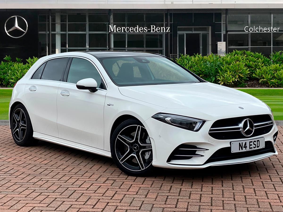 Mercedes-Benz A Class A35 4Matic Premium Plus 5dr Auto,10.25" Digital instrument cluster display screen, 180 degree rear view camera with parking guidelines, Active lane keep assist, Active park assist with parktronic system including front and rear parking sensors, Attention assist, Brake pad wear indicator warning light, Direct steering, DYNAMIC SELECT with driving programs (Slippery, Comfort, Sport, Sport+ and Individual), ECO start/stop function, Fluid level warning indicator for fuel, oil, coolant and washer fluid, Hard-disk navigation, Hey Mercedes Voice activation, Lamp failure indicator, MBUX multimedia system with DAB digital radio and touchpad including satellite navigation, Mercedes me connect including emergency call system, accident recovery, breakdown management and maintenance, Outside temperature gauge, Radio aerial integrated into roof spoiler, Service indicator (ASSYST), Speed sensitive power steering, Trip computer, Burmester surround sound system, DAB Digital radio, Dual bluetooth interface, 2 USB ports (type C), 4 Electric Front and Rear windows, Adaptive brake lights, AMG front, rear apron and side skirts, AMG radiator grille with twin louvre, Blue tinted glass, Body colour bumpers, Body colour door handles, Body colour side skirt, Body coloured door mirrors, Chrome beltline, Electric adjustable and heated door mirrors with integrated LED side indicators, Heated glass rear windscreen + timer control, Illuminated front door sill panels with Mercedes-Benz lettering, LED daytime running lights, LED tail lamp, LED third brake light, Multibeam LED with adaptive highbeam assist plus, Panoramic sliding sunroof, Privacy glass, Rain sensor windscreen wipers, Rear fog lights, Rear wiper, Two round tailpipes attached to rear apron, Wider wheel arches for AMG wheels, 12V socket, 40:20:40 split folding rear seats, Air vents surround and cruciform nozzle in silver chrome, AMG floor mats with red stitching, AMG leather on door centre panels, AMG Performance steering wheel in nappa leather, Auto Mercedes-Benz child seat recognition sensor, Beltline double topstitching, Black roof lining, Brushed stainless steel sports pedals with rubber studs, Controller on centre console with chrome surround, Cup holder and stowage compartment lighting, Electric front seats with memory function, Freight packaging without tie-down hooks, Front centre armrest with storage compartment, Front door sills with Mercedes benz lettering, Front footwell lights, Front reading lamps in left and right console downlighter, Front seat backs luggage nets, Front seat cushion length adjustment, Front signal exit lamp, Front vanity lights, Gearshift paddles on steering wheel, Handle recess/closing light, Heated front seats, Height/reach adjustable steering column, Illuminated glove compartment stowage, Interior lighting - 64 colour Ambient lighting, ISOFIX Child seat top tethers and anchor fixings, Luggage compartment cover, Oddments tray lighting, Rear armrest, Rear head restraints, Rear Reading Lamps, Seat occupancy sensor for front passenger seat, Spectacles compartment for driver, Sports seats with integrated headrests, Storage compartment under load area floor, Stowage compartment in centre console with retractable cover, Sunvisors with illuminated vanity mirrors, Touchpad, Touchpad illumination, Twin front cupholders, Two zone thermotronic luxury automatic climate control, Light and sight pack - A Class, Mirror package - A Class, Seat comfort pack - A Class, 3 rear 3 point seatbelts, ABS with Brake Assist, Active bonnet, Adaptive brake assist with hold function and hill start assist, Childproof locks manually operated for rear doors and electrically operated for rear power windows, Crash responsive emergency lighting, Driver and passenger head and side airbags, Drivers knee airbag, Dual stage Driver/Passenger Airbags, Electronic parking brake, ESP curve dynamic assist, ESP with ASR, Front and rear seatbelt reminder, Front brake callipers with Mercedes Benz lettering, Perforated front brake discs, Tyre pressure monitoring system, Warning triangle and first aid kit, Window airbags, Alarm system/interior protection/immobiliser, Keyless entry lock/unlock, Remote central locking and crash sensor with emergency opening function, Light aluminium with longitudinal grain interior trim, Summer tyres, Tirefit sealant kit