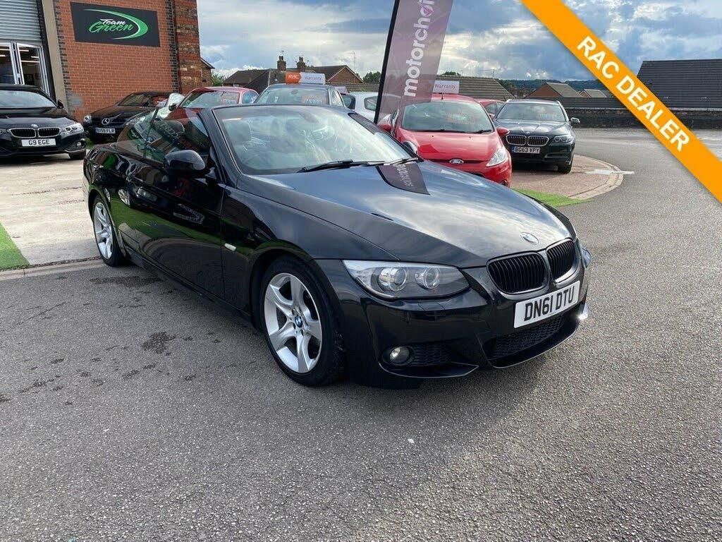2 rear head restraints, 3 spoke sports leather steering wheel/gear knob, 4 boot load lashing points, ABS, Alarm - category 1, Anti whiplash head restraints, Auto dimming rear view mirror, Automatic Stability Control (ASC), Auxiliary point for auxiliary devices, BMW professional radio/CD/MP3, Body coloured bumpers, Body coloured door handles, Body coloured electric adjustable heated door mirrors, Brake pad wear indicator warning light, Central locking button on dash, Check control system, Chrome door sill trims, Chrome exhaust tailpipe, Chrome kidney grille with black vertical slats, Cornering brake control, Cruise control, Daytime running lights, Drive away door locking, Driver/Front Passenger airbags, Dual zone automatic air conditioning, Dynamic brake control, Dynamic brake lights, Dynamic stability control, Dynamic Traction Control - DTC, Electric adjust front headrests, Electric front seats + driver memory, Electric height adjustable front seats, Electric operated/remote opening retractable hardtop, Electronic brake force distribution, Engine immobiliser, Extended lights pack - 3 Series Convertible, Fingertip control / anti-trap function on electric window, Floor mats, Folding rear seat, Folding storage compartment in door trim panels, Follow me home headlights, Front and rear electric windows, Front centre armrest with storage compartment, Front cupholders x 2, Front fog lights, Front passenger isofix child seat attachment, Front seatbelts+load limiter and pretensioner, Front side airbags, Front sports seats, Gearshift paddles on steering wheel, Headlight washer jets, Heat insulating tinted glass, Heated rear window, Heated windscreen washer jets, Integral rear window aerial, Isofix system on outer rear seats, Leather gearknob, Lidded storage compartment next to steering column, Lockable/illuminated glovebox, Locking wheel bolts, M aerodynamic bodystyling, Motor Slip Regulation (MSR) - Engine Drag Torque Control, Multi function for steering wheel, On board computer, Outside temperature gauge, Passenger airbag deactivation system, Reach + rake adjustable steering column, Rear air con vents, Remote central locking, Run flat indicator, Run flat tyres, Service interval indicator, Soft close bootlid, Stop/start button, Storage compartment in rear centre console, Sunvisors with illuminated vanity mirrors, Variable intermittent front wash/wipe, Warning triangle and first aid kit, Windscreen with grey shadeband, Xenon headlights