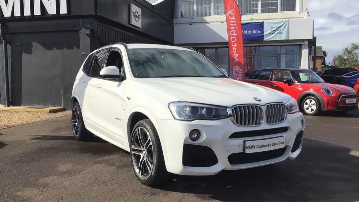 FREE NATIONWIDE DELIVERY-A stunning X3 xDrive35d M Sport comes with ls, Servotronic Steering, M Sport Pro Pack and Media package - Professional...is presented in Alpine White with Black Nevada leatherSome further advantages when choosing Snows IOW for your next BMW:As a BMW Approved Used Car, you will receive the following:- FREE Nationwide Home Delivery- Full Pre-Sale Health Check by a BMW Technician- New MOT- MOT Cover (BMW will cover potential repair costs at next year’s MOT*)- 12 Months BMW Nationwide Warranty- 12 Months BMW Roadside Assistance- Guaranteed Full Service History with all BMW Approved Used Cars- Live Video Tours available on request- Pre/Post Handover Virtual Appointment via video link with a dedicated member of our Snows BMW team- Access to the BMW Financial Services**- Expert advice throughout the ownership of your vehicle via telephone, video link, or email with our dedicated BMW teamFor an informal chat, to book a virtual appointment, or to place an order, you can call 01983 522 555 or visit www.snows.co.uk Sport Automatic Transmission with Gearsh, Performance Control, Variable Sport Steering, Sport suspension, Multifunction Controls on Steering Wheel, Run-flat Tyres, High-gloss Shadowline Roof Rails, Alarm System, Tailgate operation. automatic, Brushed Aluminium Trim, Instrument panel embellishers. black, Rear-view Mirror with Auto dimming, Sport seats, Heated front seats, Park Distance Control front and rear, Front Foglights, Auto headlights with rain sensor, Automatic Air Conditioning, Cruise Control, Additional Interior Lighting, BMW Emergency Call, BMW TeleServices, BMW Online Services, Real Time Traffic Information, Bluetooth hands-free with USB audio, DAB Radio, M Sport Exterior Styling, High-gloss Shadowline Exterior Trim, Anthracite Headlining, M Sport Package, M Sport Package, 20 inch M Double-spoke 310M wheels, Servotronic Steering, Sun Protection Glass, Headlight Washer, Xenon Headlights, Remote Services, Online Entertainment, Navigation system-BMW Professional Mult, harman kardon loudspeaker system, M Sport Pro Pack, Media package - Professional. White Full service history 5 seats.