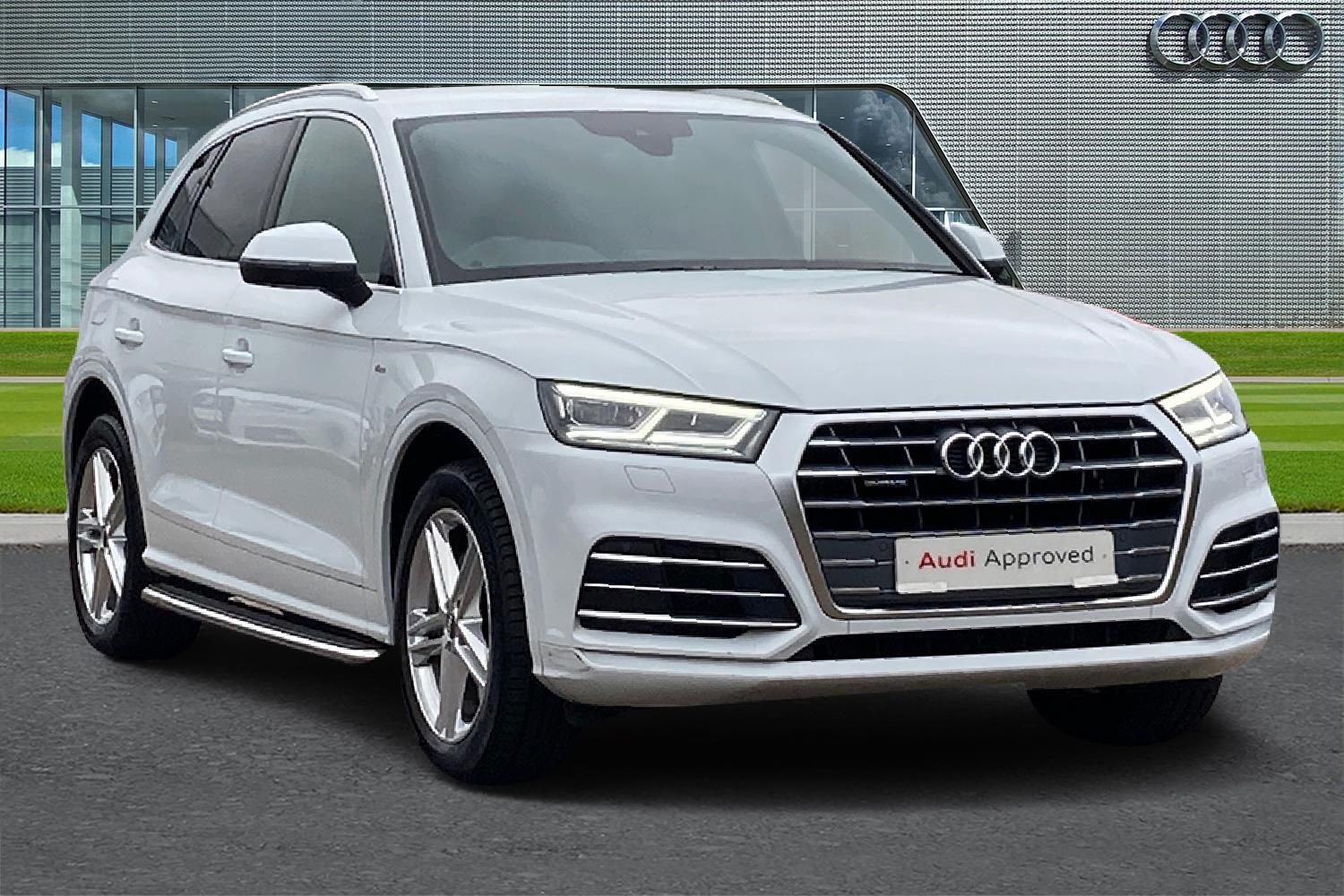 7" Colour driver information system, Audi drive select, Audi parking system plus with front and rear sensors, Audi smartphone interface, Electro - mechanical power assisted steering, MMI Navigation, Mobile telephone preparation - bluetooth interface, Power tailgate, Service interval indicator, Voice control system, Diesel particulate filter, 2x SD card slot, CD player, DAB Digital radio, MMI radio plus with 7" colour MMI screen and MMI controller, Acoustic windscreen, Air inlets in matt titanium black with blades in matt aluminium silver, Aluminium roof rails, Auto dimming rear view mirror, Automatic headlight levelling, Body colour bumpers, Body colour door mirrors, Body colour rear diffuser with matt aluminium silver surrounds, Body colour S Line side skirts, Body colour underbody protection, Chrome exhaust tailpipe, Front and rear electric windows, High beam assistant, Light and rain sensor for auto activation of lights and windscreen wipers, Loading sill protector in stainless steel, Privacy glass with front acoustic glazing, Rear wiper, S Line badges on the front wings, S Line front and rear bumpers/side air inlets and diffuser, S Line rear spoiler, Twilight grey matt radiator grille with matt aluminium horizontal chrome struts, 2 x USB charging port with aux input socket, 3 rear headrests, 3 zone climate control, 4 way electric lumbar support for driver and front passenger, 40:20:40 split folding rear seat with rear centre armrest, Black cloth headlining, Contrast stitching on seats, steering wheel and gear lever gaiter, Front centre armrest, Front sport seats with S embossed logo, Front/rear floor mats, Height adjustable front head restraints, Illuminated door sill trims with S logo, ISOFIX child seat mounting and top tether, Luggage compartment carpet, Perforated leather gearknob, Removable luggage compartment floor, Stainless steel pedals, Sunvisors with vanity mirrors, Tool kit, Trunk roller cover, High gloss pack - Q5, Non Smokers pack, 3 point seatbelts on all seats, 6 airbags - Driver, front passenger, curtain and side airbags, Electromechanical parking brake, Electronic stabilisation control including ABS, ASR and EDL, Front passenger airbag deactivation, Hill descent control, Hill hold assist, Multi collision brake assist, Pop-up bonnet for pedestrian protection, Pre sense city, Seat belt force limiter, Seatbelt monitoring, Tyre pressure warning, Warning triangle and first aid kit, Anti theft alarm, Anti-theft wheel bolts, Keyless Go access/ignition system, Remote central locking