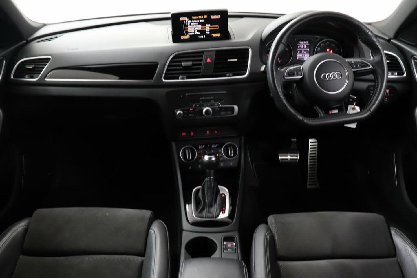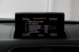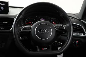 On board computer,Service interval indicator,Low washer fluid indicator,Electro-mechanical PAS,MMI - Multi Media Interface control system,Remote electric boot opening/closing,6.5" colour display screen,Audi drive select,Sports suspension,BOSE sound system,DAB digital radio module,Audi music interface,Black roof rails,Front fog lights,Rear wiper,Privacy glass,Front and rear electric windows,Heated windscreen washer jets,Auto dimming rear view mirror,Coming home function,Door mirror integrated indicators,Front lip spoiler,S Line body styling,Sunband for windscreen,LED daytime running lights,Light and rain sensor for auto activation of lights and windscreen wipers,Acoustic windscreen,Aluminium window surround,LED rear lights,Black exhaust tailpipes,LED headlights with headlight washers,Black high gloss door mirrors,Loading sill protector in stainless steel,High Gloss Black Contrast Bumpers,High Gloss Black rear spoiler,Rear diffuser with platinum insert,Front sports seats,Split fold rear seat,Height/reach adjust steering wheel,Electric front lumbar adjustment,Retractable luggage cover,Aluminium gear knob,Front and rear headrests,Aluminium door sill trims,Door sill trim strips,Stainless steel pedals,Dual zone climate control,ISOFIX on front passenger and rear outer seats,Black cloth headlining,Front centre armrest with storage compartment and angle adjustment,Reversible boot floor,12V socket in rear centre console,Under floor storage in luggage area,Storage compartment and 12V socket,3 spoke flat bottom multi-function perforated leather steering wheel with contrast stitching and aluminium gearshift paddles,LED interior light pack - Q3,Audi Exclusive black styling pack - Q3,Driver and passenger airbags,ABS+Electronic Brake force Distribution,Driver and passenger side airbags,ESP,Electrically operated child locks on rear doors,Head airbags,EDL + ASR,Curtain airbags,Tyre pressure monitoring system,Electromechanical parking brake,Front passenger airbag deactivation,3x3 point rear seatbelts,Seatbelt warning light,Remote central locking,Thatcham category 1 alarm + immobiliser,Piano black finish inlay