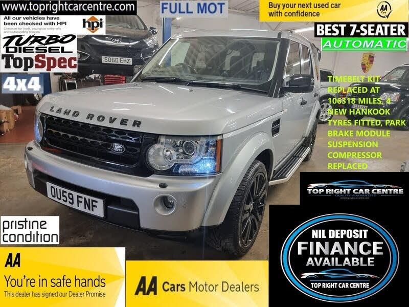 **53 POUNDS WEEKLY** *** NIL DEPOSIT FINANCE AVAILABLE ***. HPI CLEAR. PRIVATE OWNER. Timebelt kit has been changed at 106k miles. Park brake module and suspension compressor has been replaced at 83k miles billed 1800 pounds. Every now and again, a car comes into stock at Top Right Car Centre, that you cant help but fall in love with. Top Spec Discovery 4 3.0 TD V6 XS Auto 4WD 7 SEATER has touch centre screen SATNAV, Full leather interior with all heated seats, harman Kardon speakers. Cruise control. 4 wheel drive with 4 driving modes, height adjustable suspension.Tow Bar Fitted. Side steps fitted. Stunning SUV car in Silver colour with fully blacked out trims and badges. Rear Spoiler fitted. Bullet Fast response. Great very comfortable drive family SUV car. Clean body work and clean interior. Checked by our engineers. Professionally detailed. Good reliable runner. Price checked. We've just completed a full pre delivery inspection on the car to give you complete piece of mind. Recently had service done on the car by Land Rover dealer. FULL SERVICE HISTORY with bills/receipts. MOT 05 MARCH 2022 however FULL MOT ON SALE. 2 Central locking keys. Dual Digital Climate control. Chilled Air con. Parking sensors. Privacy glass. Roof rails. Decent boot size. Stunning clean car inside out. All Electric windows. Electric Auto folding side mirrors. Smooth gear box. Just refurbished Clean Glossy black Alloy wheels. Hankook directional tyres just recently replaced. spare wheel. Touch screen Multimedia has Bluetooth USB Ipod AUX DAB Radio CD Mp3. Run with no fault strong reliable engine. Good fuel economy. First see will buy it this well looked after SUV car. P/x welcome. We do price our cars/vans as competitively as possible and because of this we sell cars very quickly. (Please visit our website www.toprightcarcentre.com to view more vehicles. ***ZERO DEPOSIT LOW RATES FINANCE AVAILABLE*** WARRANTY AVAILABLE. AA 12 MONTHS BREAKDOWN COVER. WHY BUY FROM TOP RIGHT CAR CENTRE? All cars come quality checked prior to sale. HPi checked. Family run business. All our cars are hand picked and only top quality cars with great/full service history. We test drive all our cars for our peace of mind. We can organise competitive finance for you and we would be happy to take your current vehicle in as part exchange. We can find your perfect car for you at no extra cost. Delivery available . Please contact us for more details)