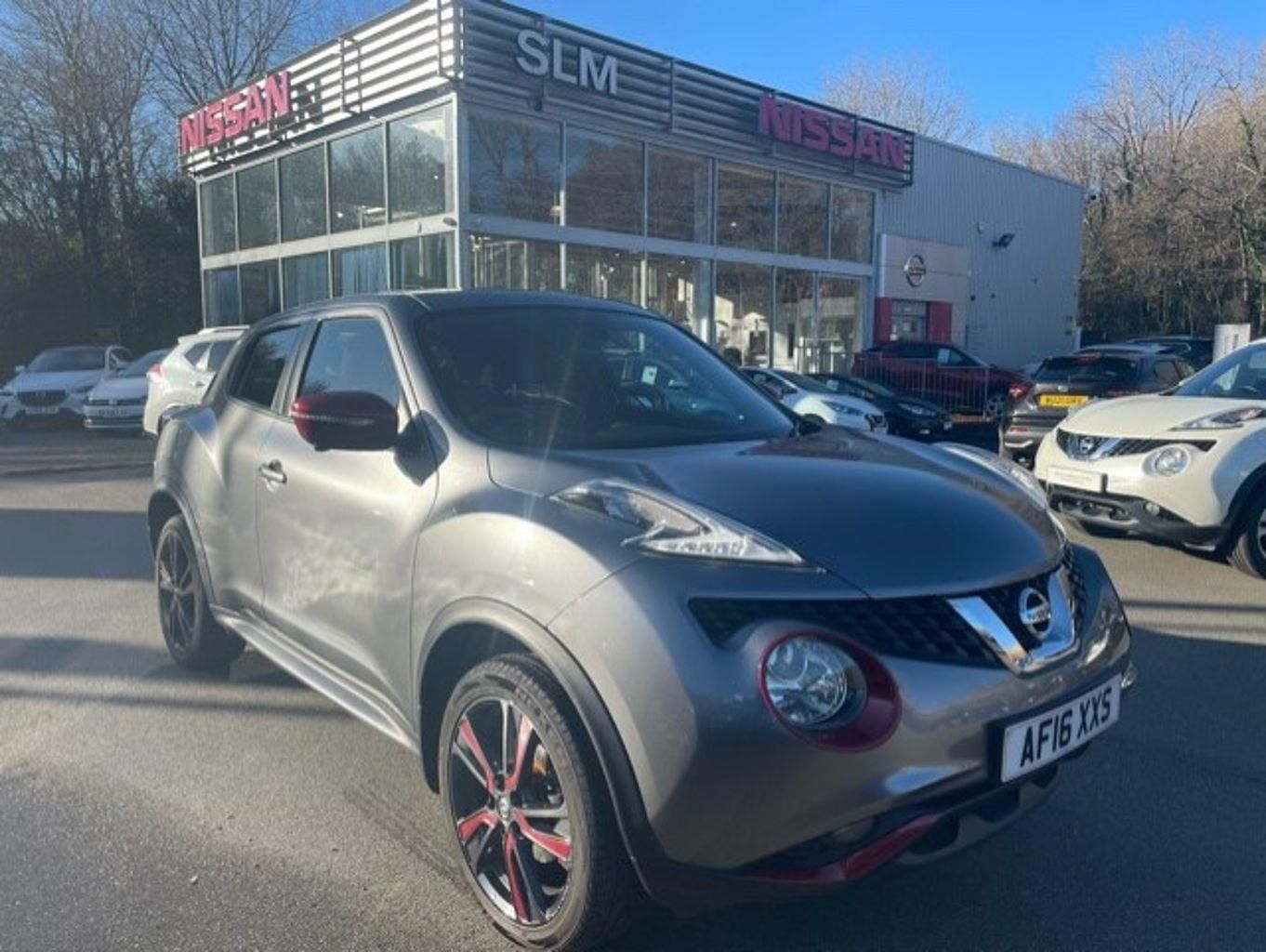 Exterior Features, Metallic paint, Packs, Exterior pack - Red - Juke, Paint - Metallic, Metallic - Gun metal, Trim - Leather, Leather - Dark grey, Exterior Features, 2 speed wipers+variable intermittent wipe, Electric front/rear windows, Privacy glass, Rain sensor, Rear wiper, Body colour bumpers, Body colour door handles, Automatic headlights, Front fog lights, LED daytime running lights, Safety, ABS + EBD + EBA, ESP + traction control, VDC Dynamic Vehicle Control, Around View Monitor, Blind spot monitoring, Cruise control + speed limiter, Electric speed sensitive power steering, Lane departure warning system, Moving object detection, Electric door mirrors, Electric folding door mirrors, Heated door mirrors, Child locks on rear doors, Driver and passenger airbags, Driver and passenger side airbags, Front and rear curtain airbags, Height adjustable front seatbelts, Passenger airbag deactivate switch, Three 3 point rear seatbelts, Tyre pressure monitoring system, Warning triangle and first aid kit, Audio / Communications, Bluetooth system, 6 speakers, Aux input, DAB Digital radio, Steering wheel mounted audio controls, Stereo radio/CD player and MP3 facility, USB port, Driver Convenience, Dusk sensor, Push button starter, Miscellaneous, Colour rear view camera, Nissan connect sat nav system, Service interval indicator, Trip computer, Interior Features, Climate control, Pollen filter, 12V socket, Front armrest, Front cupholders x 2, Front door pockets with bottle holders, Gear shift indicator, Glovebox, Internal chrome door handles, Leather steering wheel and gear knob, Leather upholstery, Luggage area under floor storage box, Rear tonneau cover integrated into tailgate, Steering wheel rake adjustment, Map reading lamp, Trim, 60/40 split folding rear seat, Front head restraints, Front seat belt pre-tensioners with load limiters, Heated front seats, Height adjustable drivers seat, Isofix child seat preparation, Passenger seat back pocket, Rear headrests, Sports seats, Security, Alarm, Immobiliser, Intelligent Key, Remote central locking, Wheels, 17 Urban alloy wheels, Tyre repair kit - Please always call us to confirm the availability of this car before visiting our dealership.