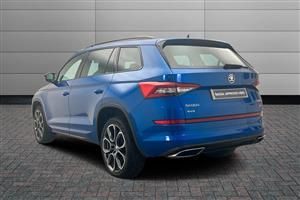 Paint - Metallic, Metallic - Race blue, Trim - Alcantara Suede, Alcantara - Black with vRS stitching and logo + sports seats, Exterior Features, Aero front windscreen wipers with intermittent function, Aero rear window wiper, Electric front and rear windows, Heated rear window, Rain and light sensors, Sunset privacy glass, Tinted windows, Dynamic Chassis Control including off-road function, Black roof rails, Black wheel arch surrounds, Black window surrounds, Body colour door handles, Dual chrome exhaust tailpipe, Front and Rear door steps, Gloss black front grille, Rear diffuser, Safety reflectors on front and rear doors, vRS badging on front grille and boot lid, vRS front and rear bumpers, Automatic activation of hazard warning lights, Full LED Headlights with adaptive front light system and LED daytime running lights, Headlight washers, High beam assist, LED front fog lights with static cornering light function, LED rear fog light, LED third brake light in rear spoiler, Light assistant (coming home/tunnel light), Safety, Electronic parking brake with hill hold control, Emergency rear braking signal, ESC (incl. ABS+MSR+ASR+EDS+HBA+DSR+RBS+MKB), Front assist includes AEB city/urban, Rear disc brakes, Red brake calipers, Drive mode selector, Progressive power assisted steering, Speed limiter, Auto dimming rear view mirror, Black door mirrors, Electrically adjustable/heated/foldable and auto dimming door mirrors with memory function, Auto door release and activation of warning lights, Driver and passenger airbags, Front and rear three point safety belt on all seats, Front side airbags, Fuel cut off safety device, Head and knee airbags, Passenger airbag deactivate switch, Safety vest holder in door, Seat belt reminder for all seats, Tailgate unlocking from outside, Two tone horn, Tyre pressure monitor, Warning lights in front doors, Interior Features, Textile floor mats, Pollen filter, 12V socket in boot, 2 rails with 2 hooks including 4 hooks for net programme, 4 foldable roof handles with rear coat hooks, 4 lashing points on luggage floor, Alcantara door panels, Alcantara upholstery with Sports seats, Aluminium pedals, Black roof headlining, Bottle holders in door panel in the 1.5 litre front and 1 litre rear, Cargo storage compartments, Centre console with open storage box, cup holder and 12V socket, Chrome headlight control button, Chrome interior door handles, Coat hooks on B pillar, Covered storage compartment on driver side, Door sill panels with KODIAQ logo, Front centre armrest with storage compartment, Gear shift lever with chrome frame and black gloss insert, Illuminated and cooled glovebox, Manually adjustable steering column, Net programme in boot (1x horizontal Net, 2x vertical Nets), Overhead glasses storage compartment, Passenger side net compartment on centre console, Rear centre armrest with cupholders, Roll up luggage compartment cover with intermediate position, Small Bags on the inner sides of the front backrests, Small pockets on the inner side of the front backrests, Storage compartment in lower middle Instrument panel, illuminated with closing, Ticket holder on A Pillar, Umbrella in door panel, Variable boot floor, vRS stitching in door panels, Front/rear courtesy lights, Illuminated luggage compartment, LED ambient lighting, Removable lamp in luggage compartment, Sunvisors with illuminated vanity mirrors, Audio / Communications, Bluetooth system, Bolero Radio, DAB Digital radio, DVD System, Dynamic sound booster, USB and SD card connectivity, Driver Convenience, ECO Stop/start function, Miscellaneous, Colour multifunction trip computer, Columbus satellite navigation with 9.2" touch screen and integrated Wi-Fi + WLAN, Digital voice enhancement, Exterior temperature indicator, SmartLink plus, Sports dials, Virtual Cockpit - 10.25" digital display, Trim, Carbon finish dashboard and door inserts, 60:40 foldable rear seat with sliding adjustment and backrest angle adjustment, Height adjustable f