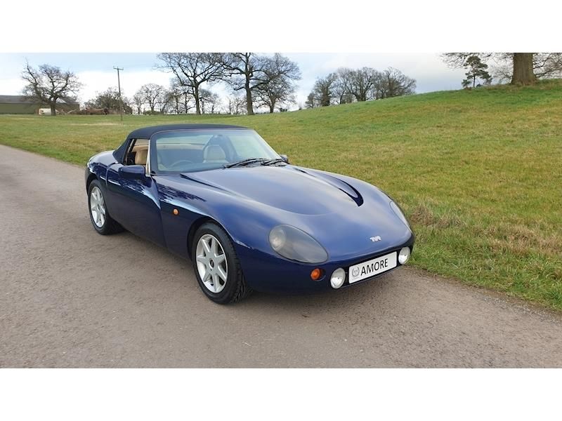 Work since 2018 includes, full chassis refurb by Taylor Tvr 2018 at 58k miles, smoked headlamp and tail covers, new clutch, master brake cylinder, steering rack, refurbished diff, upgraded 7 inch headlights, alloy radiator, ACT trumpets, Bosch injectors airflow meter and stealth cam at 37k miles. Mark Adams Tornado chip, steering rack refurb, engine core plugs replaced, new veneered dash, new Toyos tyres with Tvr stamp, lots of alloy Leven accessories, roof cover and tool bag.