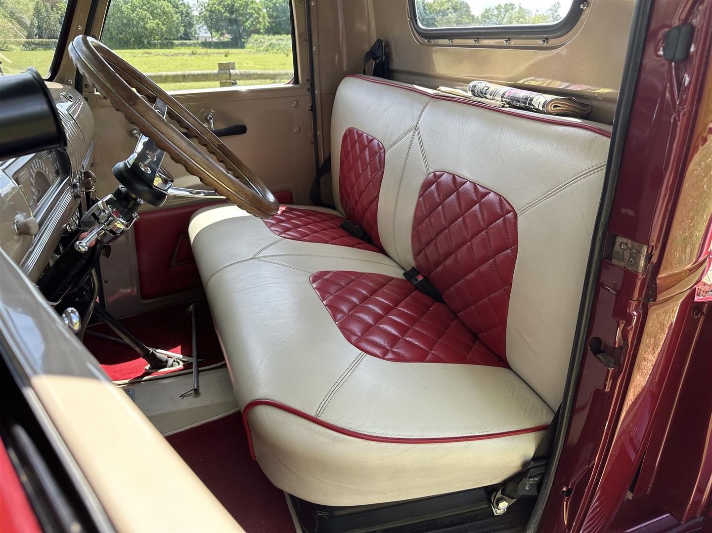 The interior is nicely done , with seat belts & supplementary gauges for temp, oil pressure and voltage. There is a hidden bluetooth stereo in the glovebox