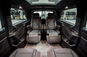 Immediately available. New VAT qualifying V300 AMG XL. Here we have Senzati's Exclusive XL conversion featuring their trademark double-glazed panoramic roof fitted into the extra-long wheelbase V300 AMG. Smooth suede headlining and pillars compliment the existing Mercedes trim. A pair of fully functioning Mercedes-Benz electric captain's chairs are fitted in the third row. These fabulous seats feature heating, ventilation, massage, electric recline, electric legrests, electric headrests and phone holders in the armrests with USB-C charging points. This lovey conversion is ideally suited to families or VIP Chauffeurs looking for the next step in luxury and practical people carriers. Senzati offer this model in both 6 and 7 seat configurations. All of the seats are reconfigurable and movable to give flexibility for additional luggage space or legroom. Some customers choose to have all seats facing forwards rather than in the club configuration pictured. The rear passenger heating controls are moved to the head lining above the third row seats and the sliding door buttons are moved to the C Pillars to aid passenger exit. The conversion is complemented with a set of Senzati leather-edged over-rugs. All of Senzati's conversions are based upon high specification V300 AMG's featuring Electric Driver and Co-Driver seats with memory, Parking Package with 360 Cameras, Smartphone Integration, Additional Battery and Increased Gross Vehicle Weight. Senzati are the only converter in this sector with both European Whole Vehicle Type Approval and Mercedes Benz Approval. All of our vehicles are manufactured at our specialist UK facility at Thruxton Airport in Hampshire. Visitors are welcomed by road or air by appointment. Every vehicle comes with 3 years Manufacturer's Warranty and you will be the first registered keeper. If this vehicle is not quite to your specification, maybe one of our Jet Class range of more comprehensive conversions would suit? There is an online configurator on our website. All prices are plus the obligatory road fund license and first reg fee of £1710.