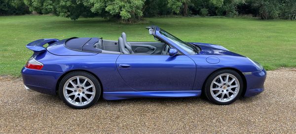 996 C2 Cabriolet (Aerokit) 6-speed manual transmission. First registered 03/09/1999 V-Registration. Finished in Zenith Blue metallic with a Full Grey leather interior. 4 former keepers and purchased directly from the last owner who acquired the car approx. 4 years ago. A particularly cherished, low mileage example presented in first-class condition throughout. Bodywork and interior are exceptional as is the condition of the fabric roof and plastic rear screen. The car comes supplied with the original factory hardtop which is also in excellent condition. The car is fitted with the clear front headlights one would associate with the 99′ model year car and sits on GT3 alloy wheels complementing the Aerokit package (rear spoiler, GT3 sideskirts, and GT3 front bumper)