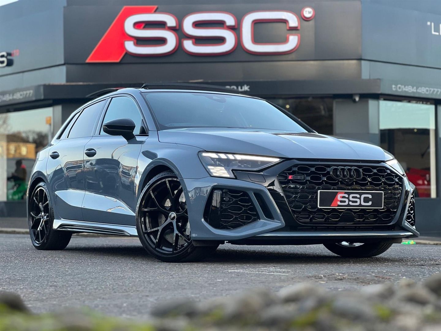 Stunning All New RS3 Sportback Vorsprung Finished In Kemora Grey With Black Quilted Fine Nappa Leather Interior. Fantastic Spec Inc: RS Dynamic Pack, RS Ceramic Brakes, Top Speed Increase, Panoramic Glass Sunroof, RS Sports Exhaust, Driver Assistance Pack, Head Up Display, Adaptive Cruise Control, Rear Camera, Park Assist, Hill Hold, Traffic Sign Recognition, Bang & Olufsen 3D Premium Surround Sound, Electric And Heated Super Sports Seats With Driver Memory, RS Specific Virtual Cockpit, Digital Matrix Headlights, Full Decorative Carbon Trim, Ambient Lighting Pack, RS Projection LED Door Courtesy Lights, Black Styling Pack, Advanced Key, Electric Folding Mirrors With Memory, Auto Dimming Mirrors, Storage And Luggage Pack, Audi Connect, Smartphone Interface, DAB, MMI Navigation Plus, Drive Select, Progressive Steering, 19'' 5 Y-Spoke RS Alloys, Split Folding Rear Seats, 4 Way Lumbar Support. This RS3 Comes With Full Service History and Remainder Of Manufacturers Warranty.