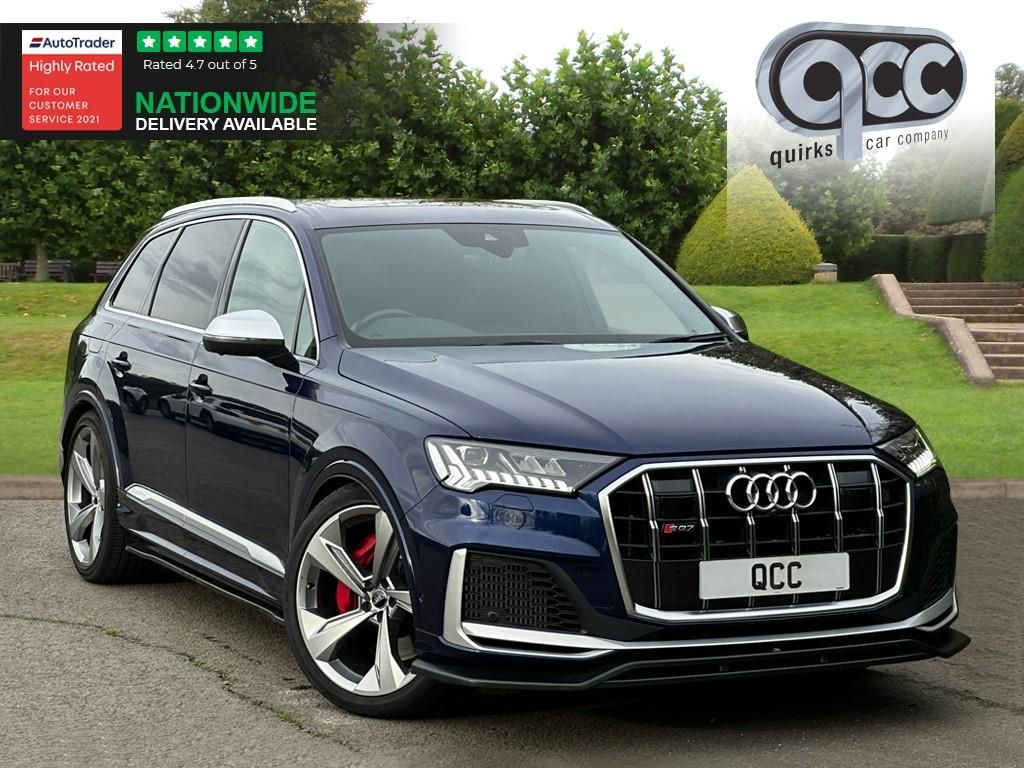 NATIONWIDE DELIVERY AVAILABLE! THIS AUDI SQ7 4.0 TDI V8 QUATTRO FINISHED IN NAVARRA BLUE METALLIC WITH BLACK QUILTED DIAMOND STITCHED VALCONA LEATHER BENEFITS FROM THE FOLLOWING SPECIFICATION, MAXTON DESIGN BODY STYLING KIT INCLUDING MAXTON DESIGN FRONT SPLITTER, MAXTON DESIGN SIDE SKIRTS, MAXTON DESIGN REAR DIFFUSER, ELECTRIC PANORAMIC GLASS SUNROOF WITH ELECTRIC BLIND, 7 SEATS WITH 3RD ROW SEATING, 22" ALLOYS, COMFORT AND SOUND PACKAGE, SAT NAV, AUDI DRIVE SELECT, AUDI VIRTUAL COCKPIT, SPORTS M/F/S/WHEEL WITH CRUISE CONTROL, ELECTRIC HEATED MEMORY SPORTS SEATS WITH LUMBAR SUPPORT, FRONT AND REAR PARK DISTANCE CONTROL, DUAL ZONE AIR CON CLIMATE CONTROL, RED BRAKE CALIPERS, AUTOMATICALLY DIMMING REAR VIEW MIRROR, AUTOMATIC HEAD LIGHTS, ROOF RAILS, POWER TAIL GATE/BOOT LID, PRIVACY GLASS, CENTRE ARM REST, PAN ROOF, BODYKIT, BODYSTYLING, QUIRKS CAR COMPANY ARE VERY PROUD WINNERS OF RUNNER UP FOR AUTOTRADER RETAILER OF THE YEAR 2021, WINNERS OF AUTOTRADER HIGHLY RATED FOR OUR CUSTOMER SERVICE 2021/20, AND WINNERS OF CAR GURUS TOP RATED DEALER 2021/20/19. WE USE THIRD PARTY SOURCES TO OBTAIN STANDARD AND OPTIONAL FITTED FEATURES AND SPECIFICATIONS. WE CANNOT BE HELD LIABLE FOR ITS ACCURACY SO PLEASE VERIFY THESE DETAILS WHEN VIEWING THE VEHICLE PRIOR TO PURCHASE. YOU MUST PHYSICALLY CHECK THE SPECIFICATION OF THE VEHICLE ON SITE PRIOR TO PURCHASE. SIMILAR TO OVERFINCH, KAHN, ONYX, REVERE, URBAN, EVOLVED, LUMMA, CHELSEA TRUCK CO, ABT ETC,