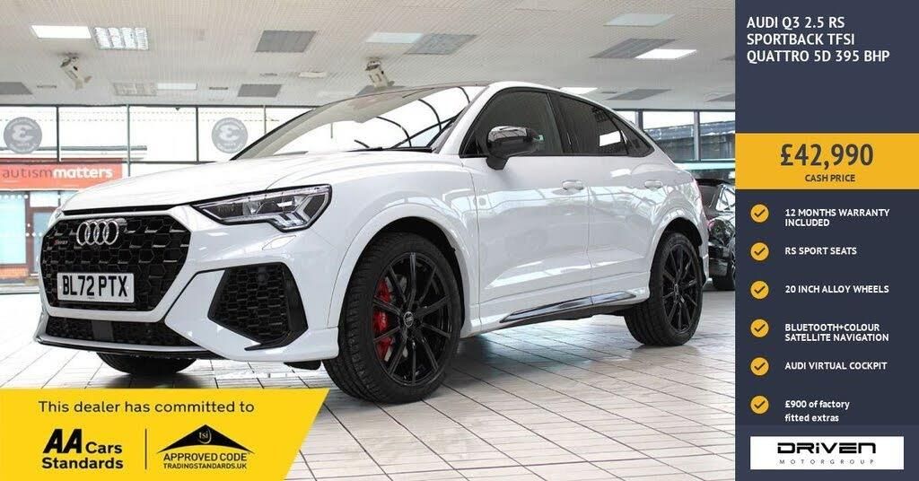 This 2022 Audi RS Q3 TFSI boasts exceptionally low mileage for its age, having covered just 15009 miles. This impressive performance SUV features a powerful 2.5 litre petrol engine paired with a four wheel drive drivetrain, ensuring dynamic handling and responsive performance. As a Euro 6 compliant vehicle, it meets modern emissions standards. Inside, you'll find a host of convenient features including the Audi Smartphone Interface which offers Wireless Apple CarPlay and Android Auto, allowing seamless integration of your digital life. For comfort, the RS Q3 is equipped with heated front seats and dual zone electronic climate control, ensuring a pleasant environment for all occupants. LED headlights with LED daytime running lights provide excellent visibility, while the Bluetooth interface allows for easy hands free connectivity. The Audi RS Q3 TFSI stands out with its remarkable acceleration, achieving 0-60mph in a swift 4.5 seconds. This performance metric indicates a level of speed and responsiveness that surpasses many other vehicles in its class. The combination of its potent engine, advanced four wheel drive system, and sophisticate COMMITTED TO AA CARS STANDARDS: 3 MONTHS OR 3000 MILES WARRANTY INCLUDED WITH AN OPTION TO UPGRADE: 12 MONTHS AA BREAKDOWN RECOVERY INCLUDED: £75.00 CONTRIBUTION TOWARDS YOUR NEXT SERVICE/MOT AT ANY AA CARS STANDARD APPROVED WORKSHOP: WE STAND BY THE QUALITY OF OUR VEHICLES. WITH THE PURCHASE OF THIS VEHICLE, YOU WILL RECEIVE 3 MONTHS OR 3000 WARRANTY, 12 MONTHS AA BREAKDOWN RECOVERY, GIVING YOU ADDITIONAL PEACE OF MIND AND PROTECTION. ALL OUR CARS COME WITH AT LEAST 6 MONTHS MOT AND PRE SALE HEALTH CHECK AND ROAD TEST. OUR PROFESSIONAL TEAM ENSURES YOUR VEHICLE STAYS IN TOP CONDITION, AND YOU ENJOY A HASSLE-FREE OWNERSHIP EXPERIENCE. 4.6 STARS ON GOOGLE WITH OVER 550 REVIEWS: JOIN OUR COMMUNITY OF SATISFIED CUSTOMERS! OUR DEALERSHIP IS PROUD TO HAVE A 4.6 STAR RATING ON GOOGLE, BACKED BY OVER 550 POSITIVE REVIEWS. WE ARE COMMITTED TO PROVIDING EXCELLENT SERVICE AND HIGH-QUALITY VEHICLES. This Vehicle Comes Equipped with High Specification, Which Includes: - Drive this car home with complete confidence and satisfaction: All cars proudly offered by driven group are rigorously inspected, hpi checked and prepared to the highest standard To drive this car home, visit www.drivegroup.co.uk or call 01642-601999 to arrange an appointment with our sales team Please note we do not operate an organised distance selling scheme as defined by the consumer contracts (cancellation, information and additional charges) regulations 2013. Therefore, even if you choose to not view your vehicle at our premises prior to purchase,you will not be entitled to cancel your order under any 14 day cancellation period. All other statutory rights remain unaffected. Whilst every effort has been made to ensure the accuracy of the information contained in this website, please check with us about any item which may affect your decision to purchase. Driven motor group shall not be liable for any errors, inaccuracies or delays in content.