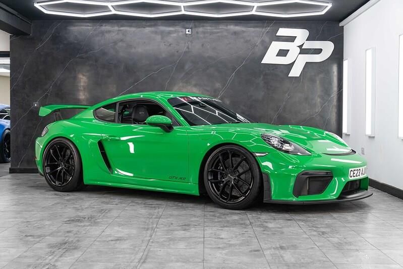 Fire extinguisher,Python Green,Smoking Package,Wheels Painted in Satin Black,Seats - Full Bucket,Electrically Folding Exterior Mirrors,Interior Package - Carbon with Leather Interior,Clubsport Package,Chrono Package and Preparation for Lap Trigger,PORSCHE Logo in Satin Black,Brake Calipers Painted in Black High-Gloss,Steering Wheel Rim with Top Centre Marking in Red,Park Assist - Rear with Reversing Camera,Race-Tex-Leather - Black with Silver Stitching and Extensive Leather, 12-Volt Sockets in Passenger Footwell and Centre Console Storage Compartment, Digital Radio, Instrument Cluster with Central Rev Counter and High Resolution 4.6inch Colour Display, PCM - Porsche Communication Management - Include Navigation, Porsche Track Precision App, Sound Package Plus, Cruise Control, Digital Displays for Vehicle Speed - Chosen Gear - Odometer -Trip Meter and Time, Park Assist - Rear, Tyre Pressure Monitoring System with Track Mode - TPM, 20in Alloy Wheels - 718 Cayman GT4 in Satin Platinum Finish with Sports Tyres, Anti-Theft Wheel Bolts, Brake Calipers - Red, Electric Windows with One-Touch Operation and Door Seal Protection Function, Electrically Adjustable Heated Exterior Mirrors on Door Waist Rails - Aspherical on Drivers Side, Fixed GT4 Rear Wing in Exterior Colour with Integrated Sideplates - Wing Uprights in Black Aluminium, Front Apron with Large Cooling Intakes, Green Tinted Heat-Insulating Glass, GT4 Logo on Gear Lever, Intelligent Lightweight in Aluminium-Steel-Composite Construction, PORSCHE Logo in Silver Colour High-Gloss on Accent Trim - Model Designation in Satin Black on Rear Apron, Rear Apron Lower Part in Black with Integrated Rear Diffuser, Separate Auxiliary Lights in the Front End with LED Indicators and Position Lights, Side Air Intakes with Sideblades Embossed with GT4 Logo Painted in Exterior Colour, Side Window Trims in Black, Twin-tract Sports Exhaust System with Two Tailpipes in Stainless Steel in Black High-Gloss, Tyre Repair Kit, Wide Opening Rear Hatch with Heated Screen, Windscreen with Darker Grey Tint at the Top to Reduce Glare, Automatic Headlight Activation including Welcome Home Lighting, Bi-Xenon Headlights with Integrated LED Daytime Running Lights, LED Taillights and Integral 4-Point Brake Lights and Reversing Lights, Adjustable Fan with Air Recirculation and Defroster Functions, Air Conditioning with Integrated Active Carbon Filter, Ascending Centre Console with an Uncovered Storage Compartment and a Closed Storage Compartment, AUTO BLIP Button to Activate Automatic Rev-Matching for Downshifts, Clothes Hooks on Seat Backrests, Door Opening Loops in Silver, Door Panel Armrest and Centre Console Main Storage Compartment Lid in Smooth Finish Leather, Door Sill Guards - Model Designation Logo, Floor Mats, GT4 Sports Steering Wheel - Rim in Race-Tex with Black Finish, Instrument Dials in Black with Yellow Indices and Scales - Rev Counter in Titanium Colour - GT4 Logo, Interior Package - Brushed Aluminium, LED Reading Lights - Orientation Lighting and Ignition Lock - Additionally Luggage Compartment and Glove Box Lighting, Luggage Compartments at Front and Rear, Roof Lining in Race-Tex, Seat Heating, Shortened Gear Lever, Sports Seats Plus - Electrical 2 Way, Sports-Look Pedals and Footrest, Storage Compartment in Each Door, Two Individual Cup Holders - Integrated into Dashboard Trim Strip, Windscreen Wiper System with Aero Wiper Blades and Washer Jets, Adjustable Chassis For Track Use, Dynamic Gearbox Mount System, Electromechanical Direct Steering with Variable Steering Ratio and Steering Pulse Generator, Engine Water Cooled with Thermal Management, Lightweight Spring Strut Front Axle - Anti-Roll Bar - Suspension Mountings Partly Ball-Jointed, Lightweight Spring Strut Rear Axle - Helper Springs - Anti-Roll Bar - Suspension Mountings Partly Ball-Jointed, PASM - Porsche Active Suspension Management - Variable Damper System with Sports Setup and Ride Height Lowered by 30mm, Alarm System, Ele