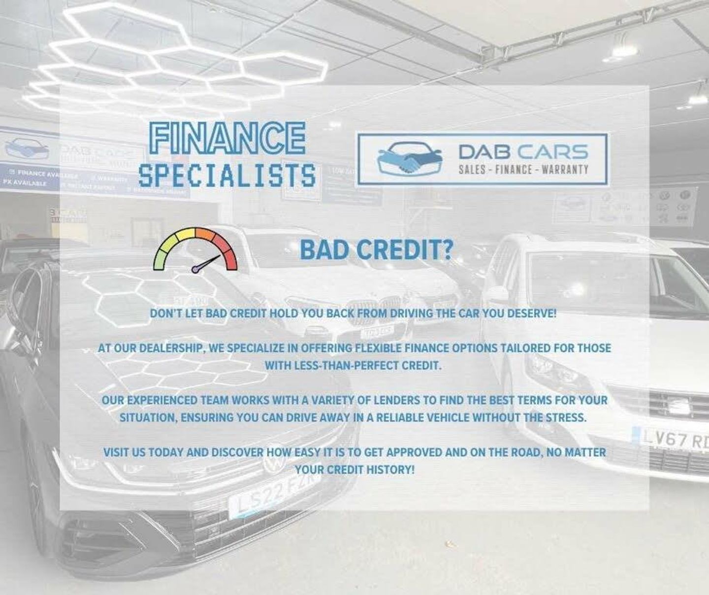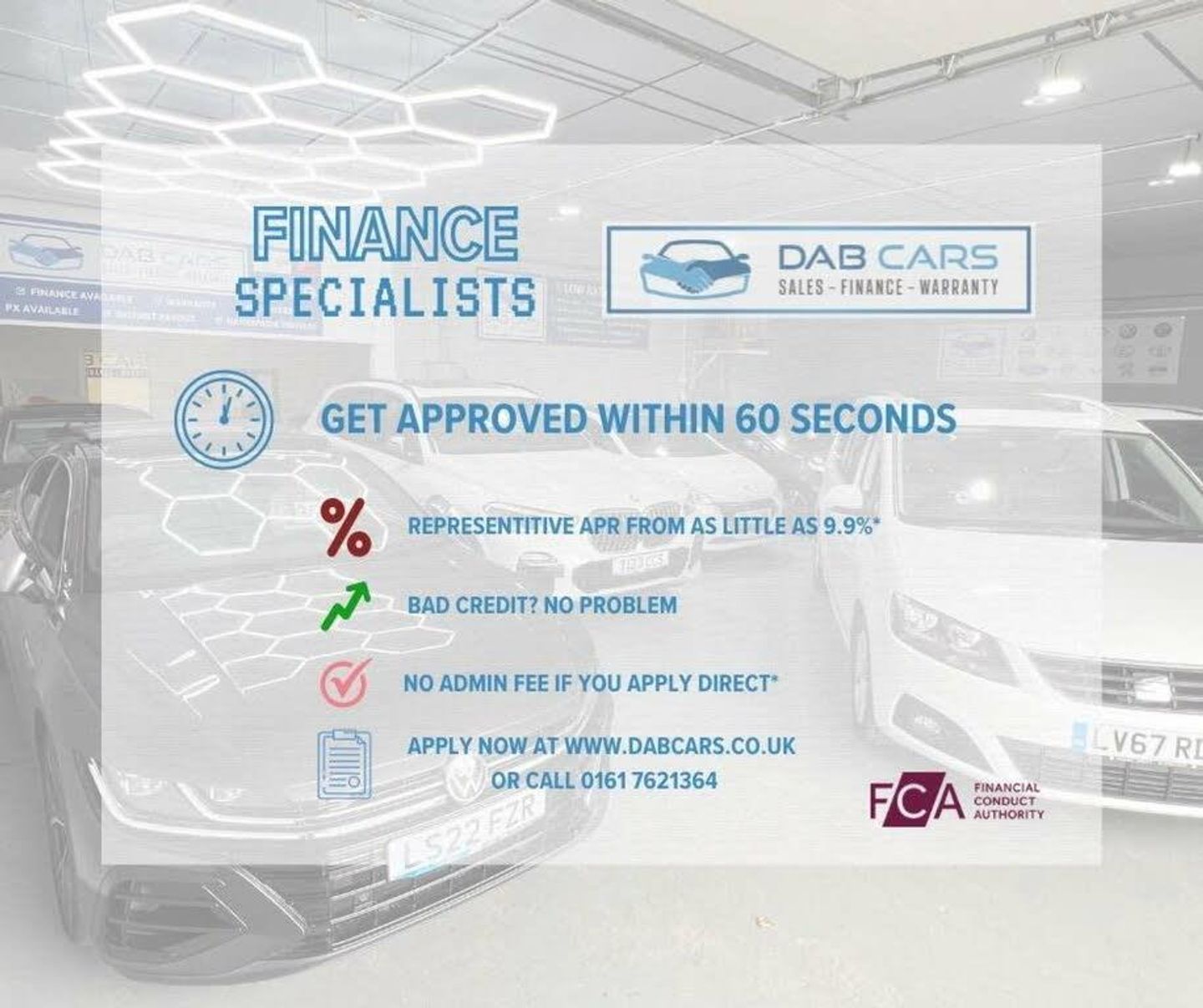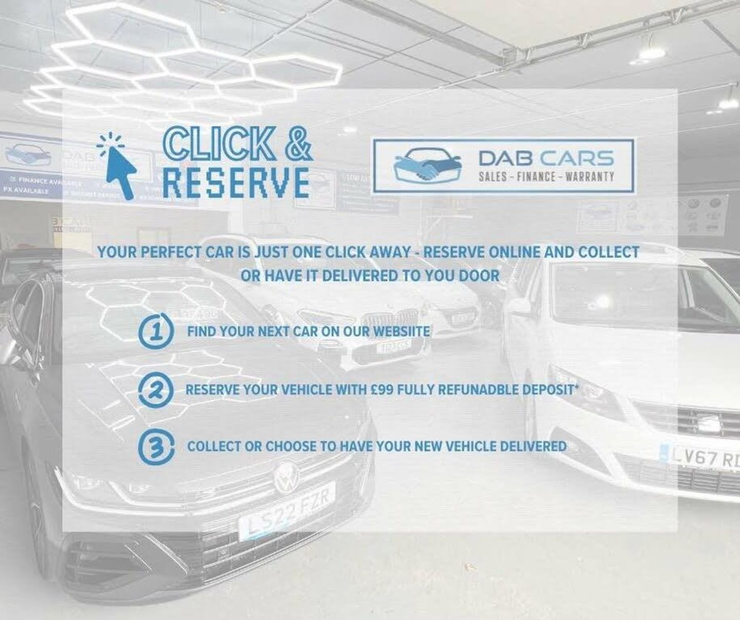 WE DO NOT CHARGE AN ADMIN FEE IF YOU DECIDE TO FINANCE YOUR NEW CAR WITH ONE OF OUR PANEL OF LENDERS. WE WILL TAKE YOUR PREVIOUS VEHICLE AS PART EXCHANGE IRRESPECTIVE OF THE VEHICLES AGE & MILEAGE. NATIONWIDE DELIVERY IS ALSO AVAILABLE AT COMPETITIVE RATES. WE OPERATE BY A VIEWING ON AN APPOINTMENT ONLY BASIS. TO BOOK A VIEWING PLEASE DO GET IN TOUCH BY EMAILING US OR GIVING US A CALL TO GET BOOKED IN FOR A SUITABLE TIME TO VIEW THE VEHICLE. TO RESERVE A VEHICLE A £250 DEPOSIT IS REQUIRED. (T&C'S APPLY). IF YOU REQUIRE ANY MORE INFORMATION DON'T HESITATE TO GET IN TOUCH. CHECK OUT OUR FINANCE CALCULATOR & MANY MORE FEATURES ON OUR WEBSITE. www.dabcars.co.uk