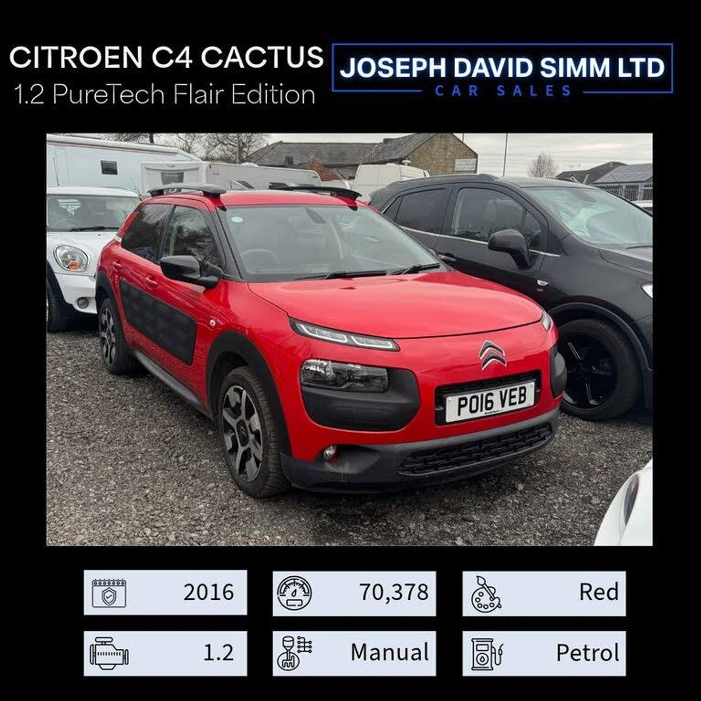Citroen C4 Cactus 1.2 PureTech Flair Edition finished in Red (Manual), 70378 miles, only 3 previous owners. Only 6,199, With over 40 years of experience in the motor trade, Joseph David Simm Ltd is your trusted partner for all your vehicle needs. Located at Front St, Bedside, Blyth, Northumberland, NE24 4HW, we pride ourselves on offering top-notch services and benefits to our valued customers, Why Choose Us?, 12 Month MOT:Every car sold comes with a 12-month MOT, ensuring your vehicle is roadworthy and safe. FCA Regulated: We are regulated by the Financial Conduct Authority (FCA), giving you peace of mind with every purchase. Finance Available: We offer flexible finance options to suit your budget, making it easier for you to drive away in your dream car. 3 Month Warranty: Enjoy a 3-month warranty on all vehicles, providing you with additional security and confidence. Extended Warranty: For those who seek extra protection, we offer extended warranty options to keep you covered for longer. Part Exchange: Part ex always welcome. https://www.josephdavidsimmltd.co.uk/cars/citroen/c4cactus/1.2-puretech-flair-edition/1372593/, For more information or to discuss your needs, please contact us on 07780196071, Joseph David Simm Ltd