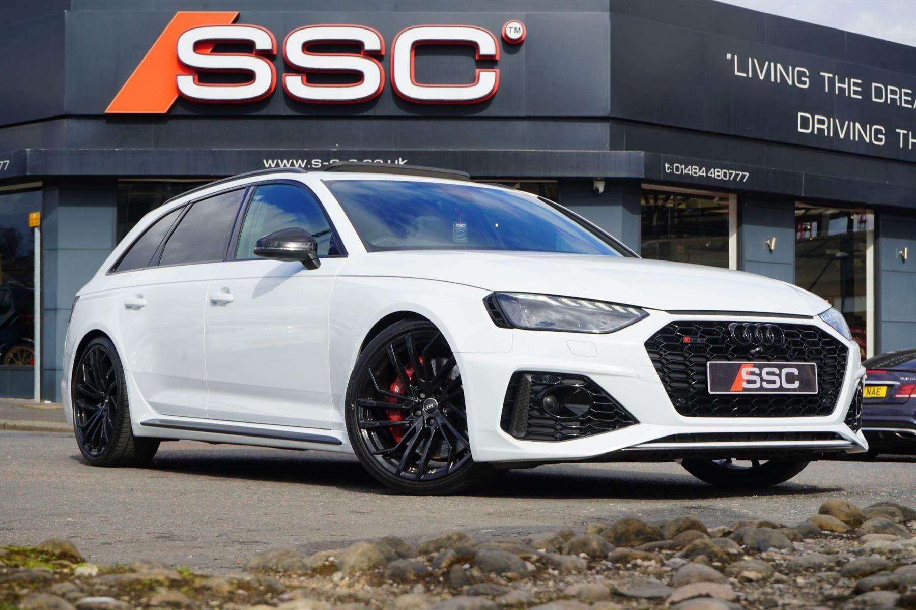 Stunning RS4 Carbon Black Finished In White With Black Quilted Fine Nappa Leather. Fantastic Spec Inc: Panoramic Glass Sunroof, Heated RS Steering Wheel, 20'' RS EVO Alloys In Gloss Black, Red RS Calipers, Comfort and Sound Pack, Bang & Olufsen Surround Sound, 360 Cameras, RS Specific Virtual Cockpit, Carbon Exterior Styling Pack, Carbon Interior Inlays, Wireless Charging, Electric Heated Super Sports Seats With Massage, Electric Folding Mirrors With Auto Dimming, Extended Interior LED Lighting Pack, Audi Parking Assistance Pack, Side Assist, MMI Navigation Plus, MMI Touch, DAB, Audi Connect, Hill Hold Assist, Apple CarPlay, Pre Sense City, Cruise Control, Power Tailgate, Matrix LED Headlights, Dynamic Indicators, Privacy Glass, Quattro With Sports Differential. This RS4 Comes With Full Service History.