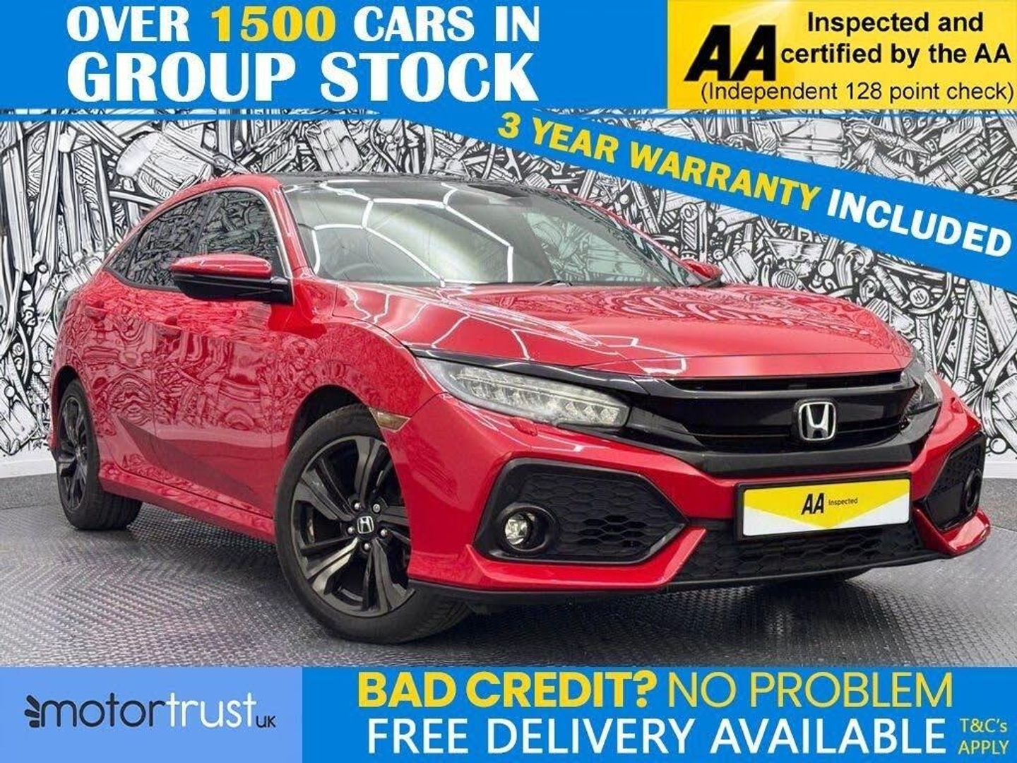 Have a butcher's at this smashing 2019 Honda Civic 1.0 VTEC Turbo EX Hatchback, finished in a cracking red that makes it a right proper standout on the road. This 5-door petrol hatch with a smooth CVT gearbox churns out 126 ps from its 1.0-litre VTEC Turbo engine, ticking all the Euro 6 boxes for a peppy yet efficient ride. With just 14,000 miles on the clock, two keys, and two owners, it's barely been tickled and is in top nick for its next driver. This Civic EX is kitted out with gear that's proper brilliant. The navigation system is a trusty pal, keeping you bang on course whether you're nipping through town or cruising the countryside. Parking sensors are a right godsend, beeping to guide you into tight spots without any faff, making parking a doddle. Climate control keeps the cabin spot on, cool in the summer or toasty in the winter, whatever the weather's chucking at you. The leather trim inside is pure class—soft and plush, it gives the cabin a swanky feel that's a cut above, perfect for a comfy ride. Rolling on 17-inch alloy wheels, it's got a sharp look and handles like a dream, while privacy glass adds a sleek, discreet edge that keeps the inside nice and private. The panoramic roof is a real corker—flooding the cabin with light, it makes every trip feel airy and special, whether you're soaking up the sun or stargazing on the way home. With only 14,000 miles, two keys, and this cracking spec—navigation, sensors, climate, leather, panoramic roof, and more—this red Honda Civic EX is a low-mileage belter, blending style, tech, and a bit of luxury for its next owner to have a right good time with! Welcome to MotorTrustUK, where exceptional standards and customer satisfaction are at the forefront of our service. All of our retail vehicles undergo a rigorous 128-point mechanical inspection, independently carried out by a qualified AA technician, to ensure the highest level of reliability and safety. Should any vehicle have less than six months remaining on its MOT or be due a service, these requirements will be addressed prior to delivery. For added reassurance, we include a complimentary nationwide warranty with all qualifying vehicles. With approximately 1,500 vehicles currently in group stock, a number that continues to grow, we are pleased to offer part exchange services, accept all major credit and debit cards, and provide flexible finance options, including HP, PCP, and subprime solutions. Nationwide delivery can also be arranged by quotation. While every effort is made to ensure accuracy in vehicle specifications and descriptions, details may vary; we encourage all customers to speak with a member of our sales team to confirm key information such as MPG figures, available keys, or any factory modifications. To ensure smooth processing and support, an administrative fee is applied to all completed sales. We look forward to assisting you in finding your next vehicle with confidence at MotorTrustUK.