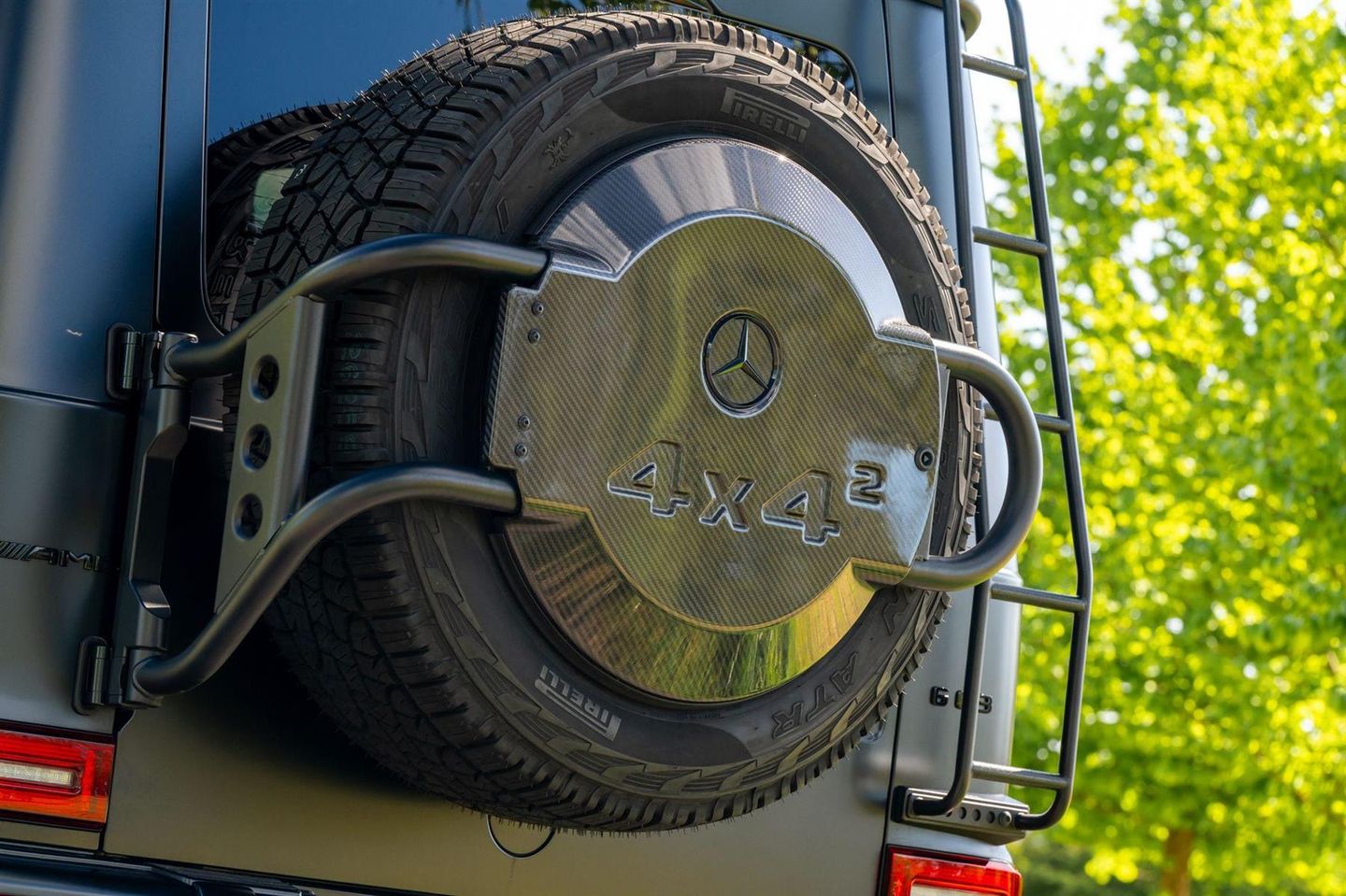 - Professional Spare Wheel Holder with Exclusive Carbon-Fibre Cover and 4x4 Lettering