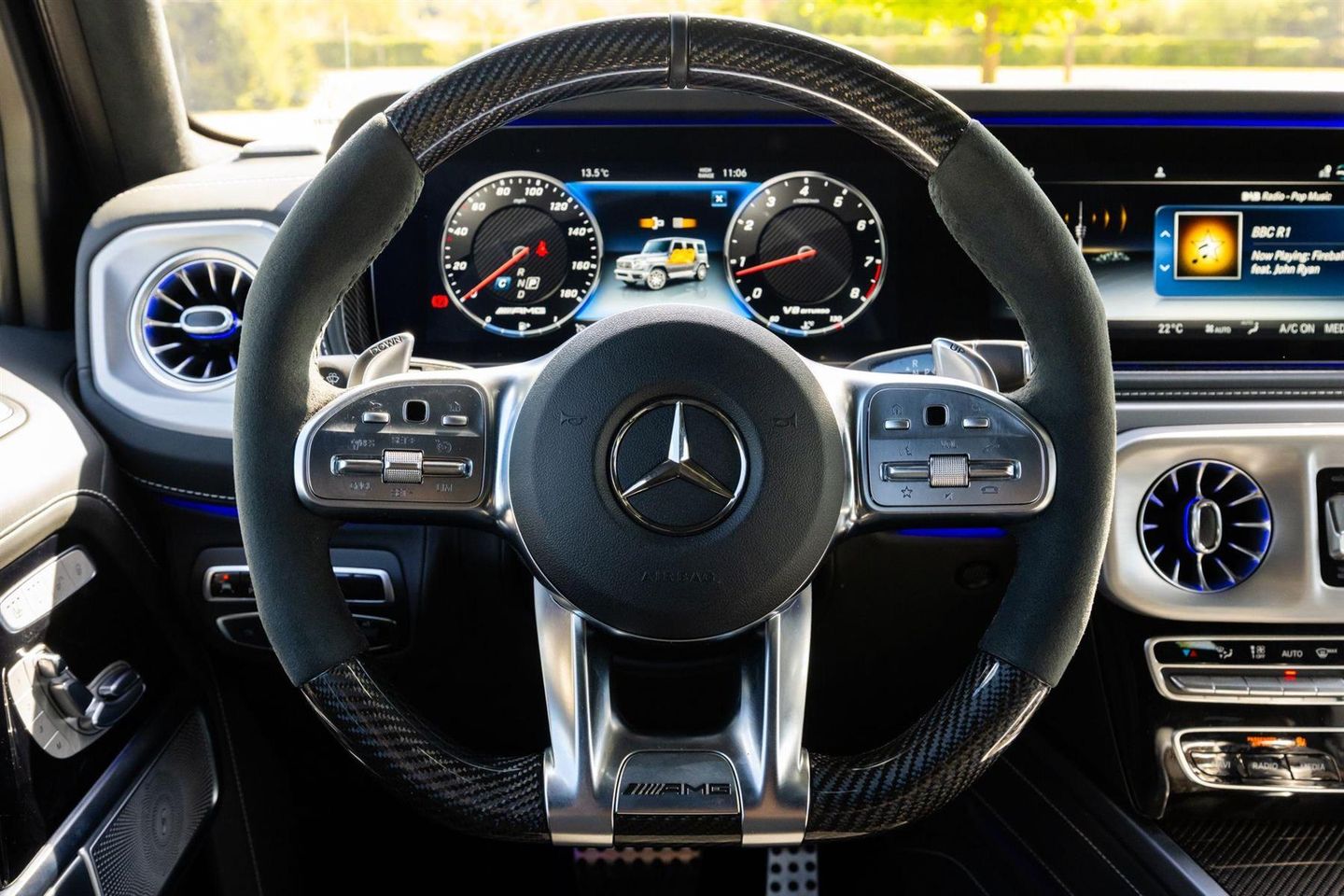 2023 '73 Plate' With 530 Miles. Finished In Night Black Magno G Manufaktur With Black Nappa Leather With Contrasting Topstitching In White. Left-hand drive, 22'' Inch AMG multi-snoke forned wheels, Lane Keeping Assist, AMG carbon-fibre engine cover, AMG brake callipers, painted silver front and rear Simulated under guard in night black Magno, Exterior protective strip with trim insert in carbon-fibre look AMG-specific radiator grille in dark chrome, Mercedes star with front and rear in high-gloss black, TV receiver, Burmester® surround sound system, Parking Assist, Sliding sunroof, Heated windscreen, 360° camera, AMG Performance steering wheel in carbon-fibre design / MICROCUT micro, Heated multifunction steering wheel, AMG Night package, AMG Night Package II, Trim moulding with ''G Manufaktur'' lettering And AMG carbon fibre trim. Under Manufactures Warranty Until 06/09/2026.