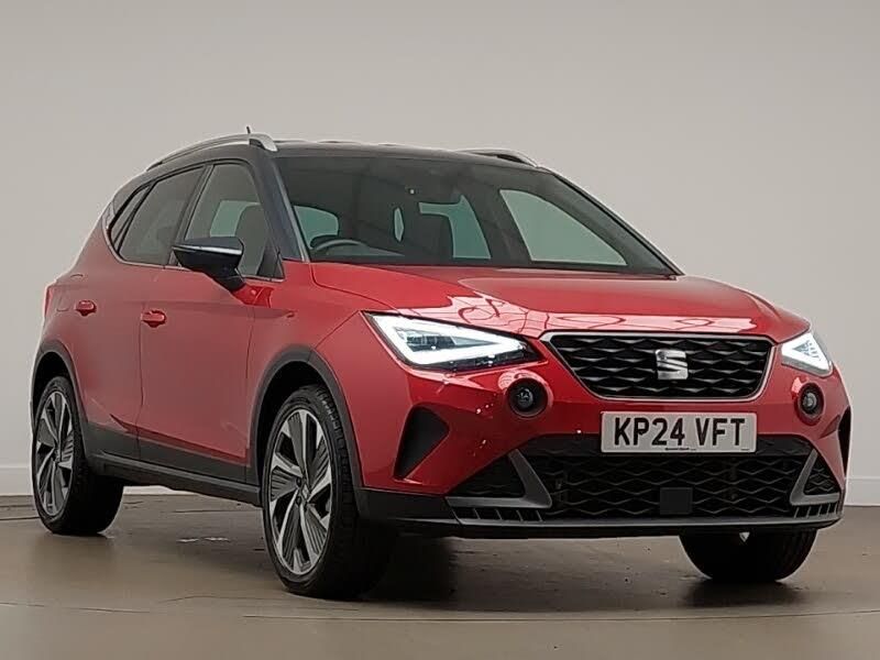 Android Auto, Apple CarPlay, LED daytime running lights, LED Headlights, MirrorLink, Rear parking sensor, Steering wheel audio controls, Interior chrome pack - Arona, Safe and driving pack (S) - Arona, Microsuede cloth - Black with Contrast lava red stitching, 10" Digital cockpit, Full Link Smartphone Integration with Mirror Link, Apple Car Play, Google Android Auto with USB Type C cable for Apple and Android compatibility, Lane keeping system, SEAT Drive profile - Four different models normal-sport-eco-individual, steering response, throttle response, Wireless phone charger, Cruise control and speed limiter, 9.2" colour touchscreen with navigation system, voice control and USB port (type c), Bluetooth interface for hands free and audio streaming, DAB digital radio and AM/FM radio, Auto dimming interior rear view mirror, FULL LED automatic headlights with dynamic headlight range control, coming and leaving home, LED daytime running lights, Electrically adjustable, heated and folding door mirrors, Dark tinted rear windows, Metallic paint with contrast roof, Dual zone climate control, Front comfort seats, Heated front seats, Interior ambient lighting, Microsuede cloth upholstery, Perforated flat bottomed leather steering wheel/gear knob/handbrake with red stitching and FR logo, Double boot floor
