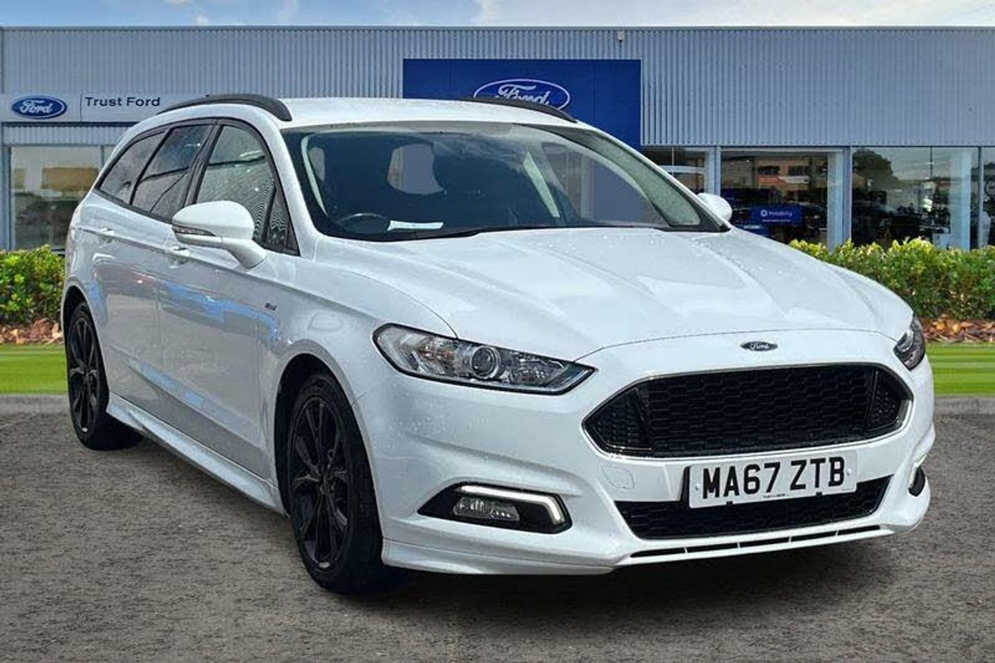 'Ford Power' starter button, Bluetooth connectivity with voice control, Easy fuel capless refuelling system, Ford DAB navigation system with 8 speakers, Ford SYNC 3 with 8 colour touch screen, Front and rear parking sensors, PAS, Service indicator, SYNC Emergency Assistance, Trip computer, 'Quickclear' heated windscreen/heated washer jets, Black roof rails, Body colour sports design rocker panel mouldings, Body coloured bumpers, Bright front scuff plates with ST logo script, Chrome window surround, Electric adjustable door mirrors, Electric front windows, Electric rear windows with global open and close, Gloss black fog light bezels, Halogen projector headlights, LED daytime running lights, LED tail lights, Power folding door mirrors with puddle lights, Rear spoiler, Rear wiper, ST-Line badge, Upper front grille chrome surround, Accented red stitching to steering wheel, centre console and door trims, Alloy Foot Pedals, Ambient lighting, Centre console with armrest, Dark headlining, Driver's lumbar support, Dual zone automatic climate control, Folding rear seats, Front headrests, Height adjustable passenger seat with lumbar support, Isofix on 2nd row rear seats, Perforated leather steering wheel, Premium velour floor mats, Rake/reach adjustable steering wheel, Rear armrest, Rear headrests, Ski hatch, Sports seats, Tonneau cover, Vector Cloth Upholstery, 3x3 point rear seatbelts, ABS+EBA, Active city stop, Curtain airbags, Driver/front passenger airbag, Drivers knee airbag, Electronic parking brake, ESP + traction control, Hill start assist, Intelligent Protection System (IPS), Tyre pressure monitoring system
