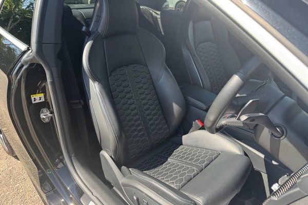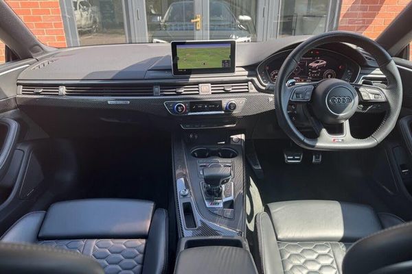 Storage Package, Fine Nappa Leather - Super Sport Seats - Black with Rock Grey Stitching, RS Matrix LED Headlights with LED Rear Lights and Dynamic Front and Rear Indicators, Ceramic Brakes, Head-Up Display, Top Speed Restriction Increase to 174mph, Tyre Pressure Monitoring System, RS Suspension Plus with Dynamic Ride Control - DRC, Mythos Black, Dynamic Steering, Rear-View Camera, Audi Phone Box with Wireless Charging, Comfort and Sound Package, Inlays - Carbon, Extended LED Interior Lighting Package - Multi-Coloured, Electrically Adjustable Front Seats with Memory Function for Drivers Side, Privacy Glass, Carbon Matt Aluminium Styling Pack, Carbon Engine Cover, Door Mirrors - Folding with Auto-Dimming and Memory Function, 20in Alloy Wheels - 5-Arm-trapezoid Design Forged in Anthracite Black - Diamond Cut Finish, RS Sports Exhaust System, 19in Alloy Wheels - 10-Spoke-Star Design Forged in Silver, 6-Airbag System, ABS - Anti-Lock Braking System, Anti-Theft Alarm, Audi Connect Infotainment Services - 36 Month Trial, Audi Connect Safety and Service, Audi Side Assist, Audi Smartphone Interface, Audi Sound System, Audi Virtual Cockpit, Auto-Dimming Rear-View Mirror, Cloth Headlining in Black, DAB Digital Radio Reception, Deluxe 3-Zone Electronic Climate Control, Door Mirrors - Electrically Folding - Adjustable and Heated with Integrated LED Side Indicators and Kerb-view Function for Passenger Side, Door Mirrors - Matt Aluminium Look Housings, Door Sill Trims - Illuminated with RS5 Logo, Electric Windows - Front, Electrically Adjustable Front Seats, Electromechanical Power Steering, First Aid Kit and Warning Triangle, Flat-Bottomed High Multi-function 3-Spoke Leather Sport Steering Wheel with RS Badging, Front Centre Armrest, Front and Rear Floor Mats, Heated Front Seats, High-Beam Assist, Hill Hold Assist, Inlays - Aluminium Race, LED Headlights with LED Rear Lights and Dynamic Rear Indicators, LED Interior Light Package, Leather Door Armrests and Knee Pad, Lumbar Support - Pneumatically Adjustable with Massage Function, MMI Navigation Plus including MMI Touch, Multi Collision Brake Assist, Pedals and Footrest - Stainless Steel, Pop-Up Bonnet for Pedestrian Protection, Pre-Sense City, RS Audi Drive Select, RS Body Styling, RS Exhaust System, RS Sports Suspension, RS-Specific Gear Lever Knob in Perforated Leather with Contrast Stitching, Remote Control Key with RS Emblem, Seat Belt Monitoring, Space Saver Spare Wheel, Split-Folding 2-Seater Rear Seat Bench in 3 Parts - 40-20-40 with Rear Centre Armrest, Tool Kit and Car Jack, Windscreen with Acoustic Glazing, quattro with Sports Differential