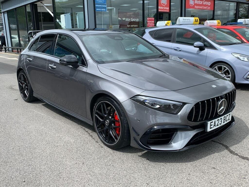 Here we have a 2023 Mercedes-Benz A45S AMG S Plus 8G-DCT 4MATIC+ finished in Mountain Grey Metallic with Black Leather Interior with Yellow Stitching covered just 13,250 miles from just 1 owner from brand new with Full Mercedes Benz Service History (serviced at Mercedes Benz Swindon Main Dealer this year in January 2025).We are delighted to offer this stunning Mercedes AMG Hyperhatch and the highest specification model being this the A45 S Plus Model coming fully loaded including AMG Aero Package. This A45 S AMG is the newest up-to date/refreshed facelift model being a 2023 Model Year car featuring: the newest AMG Performance Steering Wheel (with new Haptic Controls), Revised LED Headlights, Revised Rear Lights, AMG Affalterbach Bonnet Badge, New Updated MBUX Infotainment/Entertainment System and New Design AMG Front Grille. Specification very high on this range topping model including: AMG Aeropack, AMG Night Package, AMG Performance Bucket Seats including Lumbar Support, Heated Seats, AMG Alcantara/Leather Performance Steering Wheel, Burmester Hi-Fi System, 360 Degree Camera, Panoramic Sliding/Tilt Roof, 19'' Black AMG/Silver Lip Wheels, MBUX Multimedia System, Head Up Display, Active Lane Assist, Active Brake Assist, Keyless Go, Interior Ambient Lighting (range of colours), Speed Limit Assist,Parking Package, USB Socket Pack (USB C Sockets), Adaptive Headlights and much much more. This is a very special AMG hatchback which offers huge performance which can be used daily/in any weather with 4-Wheel Drive/420BHP/DCT 8 Speed Gearbox.Huge levels of technology and comforts in this car - feels, drives and looks very special. Cabin is a stunning place to be loaded with lots of technology/comforts/AMG Touches.Giant slaying performance on offer, very fast cars. Amazing Hyperhatch. Mountain Grey Metallic against the AMG Aero package in Gloss Black looks very tasteful on this A45 S. Stunning car that looks awesome on the road.Ultimate AMG hatchback.Presented in excellent condition with low miles.Remainder of Mercedes Benz Warranty.-Newest Model+1 Owner+A45S Plus-*Open 7 Days A Week*All Major Credit&Debit Card Accepted*Please check our website for further detail