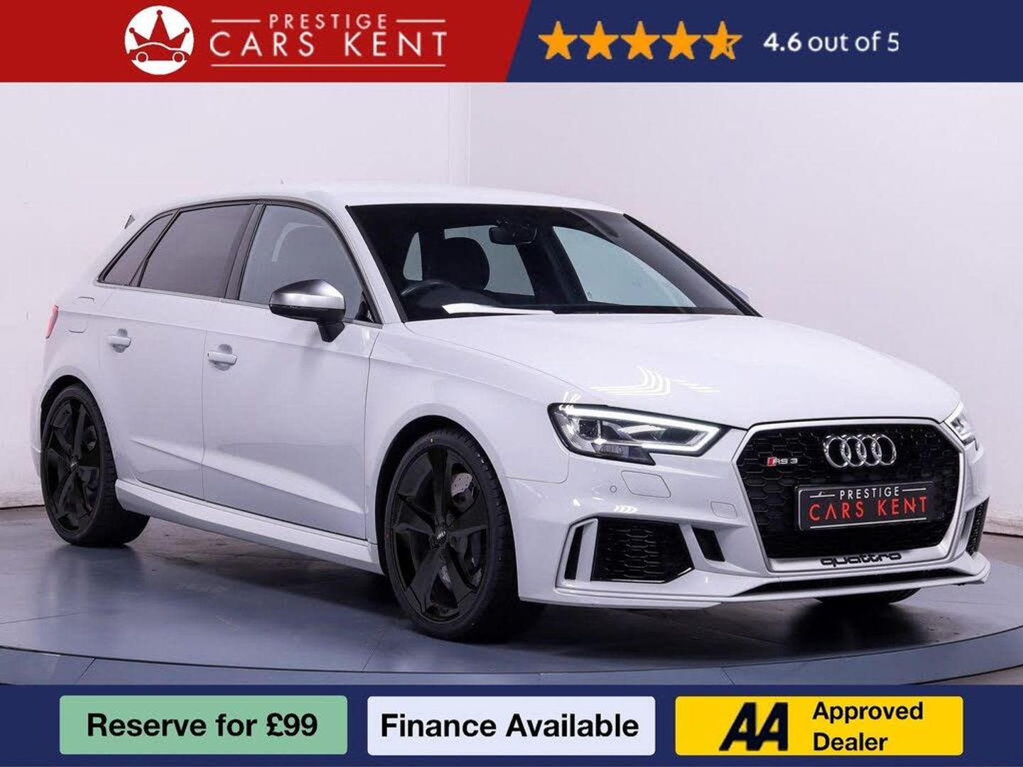 Audi RS3 Sportback 2.5 TFSI quattro Turbocharged Precision. Everyday Supremacy. Uncompromising in performance and bold in character, the Audi RS3 Sportback is the ultimate evolution of the hot hatch. Powered by the legendary 2.5 TFSI five-cylinder engine and quattro all-wheel drive, it delivers brutal acceleration, razor-sharp handling, and daily usability all in one perfectly engineered package. Why Choose the RS3 Sportback?The RS3 combines motorsport heritage with advanced tech and Audi craftsmanship. The S tronic dual-clutch gearbox delivers lightning-fast shifts, while RS Sports Suspension and performance styling ensure every journey feels like a pole position start. This isnt just performance its precision engineered adrenaline. Features We Love RS Virtual CockpitFully digital display with RS-specific layouts and performance data right in your line of sight. RS Flat-Bottomed Steering WheelFinished in perforated leather with multifunction controls made for spirited driving. Parking System PlusUltrasonic sensors with visual aid to make parking stress-free even in tight urban spots. Audi Smartphone InterfaceSeamlessly integrates your Apple or Android device with the infotainment system. RS Sports SuspensionLowered stance and dynamic damping deliver thrilling control and cornering stability. 3D Titanium Grey InlaysAdds depth and sporty contrast to the interior every detail reflects RS exclusivity. Why Buy from Prestige Cars Kent? 175-Point Quality Check 90-Day Guarantee Full Vehicle Valet & Preparation Nationwide Delivery Options Available Call Us Now: 01689326861 Prefer email? Submit your enquiry online and let us do the rest. Admin fee applies. All specs should be verified as some details may be autogenerated.-PARKING PLUS/APPLE CARPLAY-All cars are HPI and 175-Point Checked.