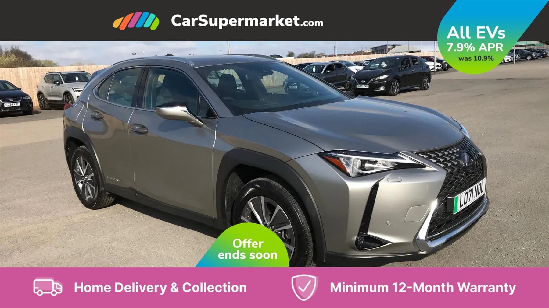 Android Auto, Apple CarPlay, Bluetooth, Cruise Control, Heated Front Seats, 17" Alloy Wheels;With exceptionally low mileage for its age at just 12698 miles, this 2022 Lexus UX 300e presents a compelling opportunity. This electric vehicle combines Lexus luxury with the benefits of electric driving. The car has a clear vehicle history check and a MOT valid until February 2026, offering peace of mind. The last service was completed on 6th March 2025 at 12694 miles. Manoeuvring is made easier with the reversing camera, which features back guide lines and parking assistance. The Lexus UX 300e has a battery with a total capacity of 54 kWh, offering a maximum range of 196 miles when new. Charging at home using a 7kW charger takes approximately 8 hours and 12 minutes. For faster charging on the go, it achieves an empty to 80% charge in just 50 minutes at the fastest public charging points. The vehicle also features a large boot space, making it more practical than other similar vehicles.