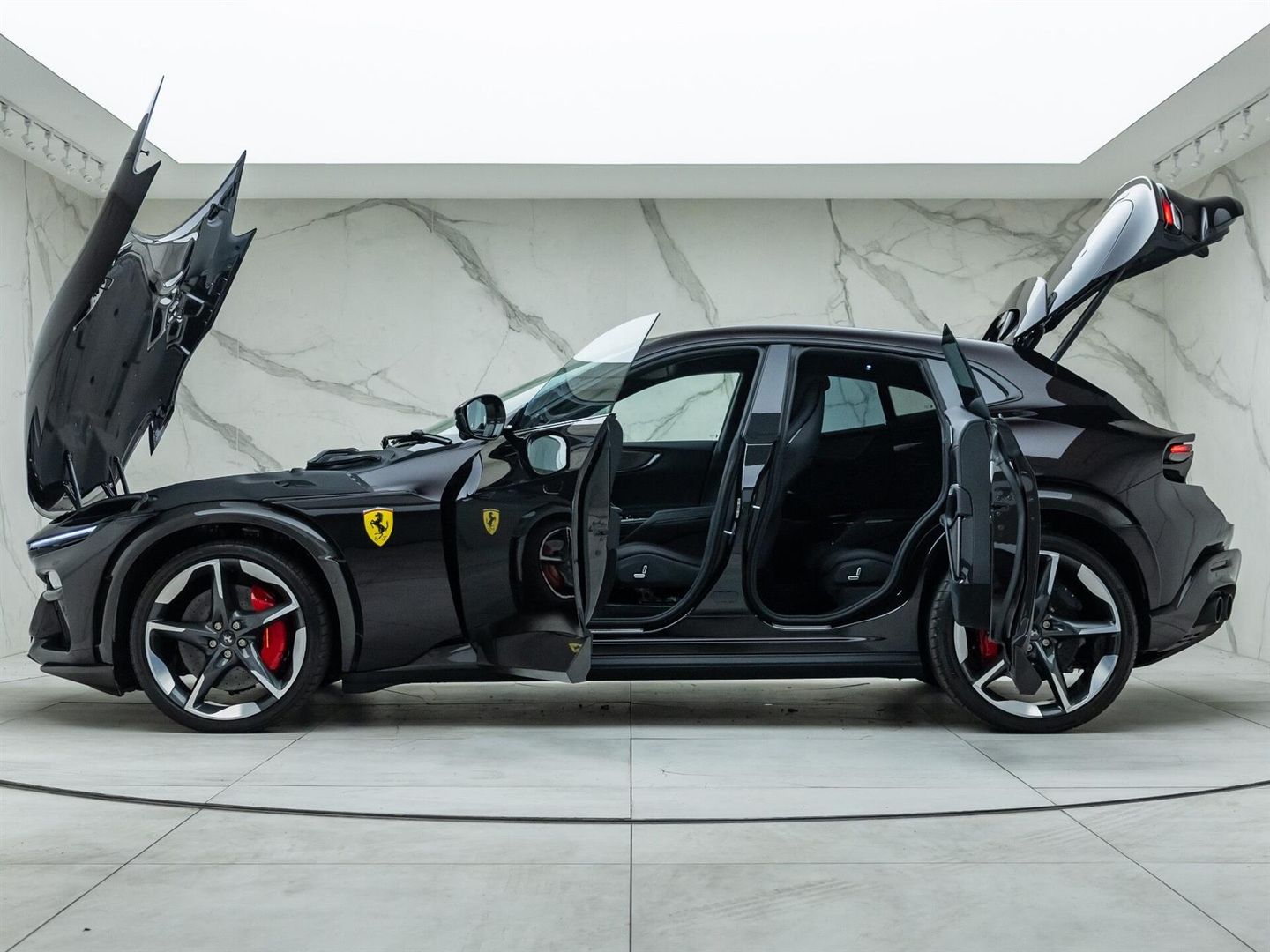 Finished in Special 'Nero Purosangue' Paint,Including Panoramic Roof & Front Lift,Ferrari Manufacturer’s Warranty until April 2028,Ferrari 7 Year Servicing Plan until April 2031,Paint Protection Film (PPF) Applied to Whole Car,UK Supplied,10.2'' Passenger Display,4-Zone Air Conditioning,Automatic Rear Doors,Blind Spot Detection,Burmester High-End Audio System,Carbon Ceramic Brakes,Ferrari Active Suspension,Front & Rear Parking Sensors,Infotelematic System with Bluetooth Audio Streaming,ISOFIX for Rear Seats,Lane Departure Warning,Lane Keeping Assist,Rear Parking Camera,Rear Wheel Steering,Soft Door Close,22/23-Inch Glossy Forged Diamond Wheels,Special Colours - Nero Purosangue,Carbon Fibre Wheel Arches,Carbon Fibre Rear Diffuser,Carbon Fibre Front Spoiler,Carbon Fibre Underdoor Cover,Carbon Fibre Wheel Caps,Carbon Fibre Steering Wheel with LEDs,Upper Part of Centre Console in Carbon Fibre ,Carbon Fibre Door Panels,Active Matrix LED Headlights,Panoramic Roof,Front Lift,Smartphone Interface,Surround View,Digital Rear-View Mirror,Wireless Smartphone Charger,Heated Steering Wheel,Air Quality Sensor,Luggage Compartment Kit,Long, Narrow Italian Flag,Nero Leather Upholstery ,Upper Part of Passenger Compartment in Nero Leather,Coloured Standard Stitching in Rosso,Cavallino Stitched on Headrests in Rosso,Rev Counter in Yellow,Matt Black Rear Cavallino,Cavallino & Satin Ferrari Badge,Black Tailpipe Tips,Red Brake Calipers,Privacy Rear Windows,Titanium Wheel Bolts,Paint Protection Film (PPF) Applied to Whole Car,