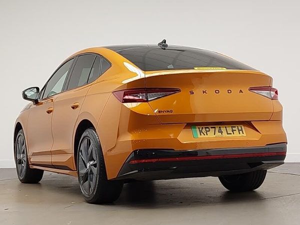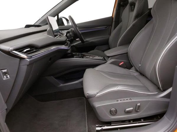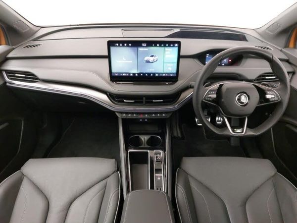 Adaptive cruise control, Android Auto, Apple CarPlay, Heated steering wheel, LED daytime running lights, MirrorLink, Rear parking sensor, Speed limiter, 13" touchscreen display, Adaptive Cruise Control with traffic jam assist, Blind Spot Detection (BAS), Digital cockpit, Drive mode selector, Electrically operated tailgate with kick activation (virtual pedal), Front and rear parking sensors, Gesture control, Rear view camera, Satellite navigation system, Skoda Connect iV remote services with charging, air conditioning and smart schedules, Travel assist with emergency assist, lane assist plus with narrow lane assist and urban evasive steering support, Traffic sign recognition, Wi-Fi hotspot, Wireless charging with cooling function, Wireless smartlink, Full LED Matrix beam headlights with variable light distribution, Full LED rear lights with variable lighting functions, Heat insulating glass in windshield, Heated rear window, LED daytime running lights, Heat insulating darkened glass in side and rear windows, Heated front seats, Crystal face, Door mirror memory, Dynamic headlight range control with cornering light function, Electric front and rear windows, Electric adjustable heated folding door mirrors with boarding spots and welcome logo, vRS sports bumpers, Panoramic sunroof, LED ambient lighting, Electrically adjustable driver seat with memory function