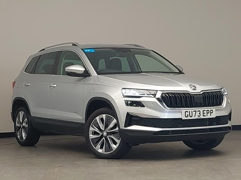 Satellite navigation, SmartLink wireless for Apple and wired for Android, 8" Digital display, DAB radio with Bluetooth, USB connection, Heated front seats, 2 spoke leather heated multifunction steering wheel with DSG paddles, Heated steering wheel, Dual zone climate control, Microsuede cloth/leather upholstery, Driver fatigue sensor, Start/stop system with regenerative braking, USB C Port x 2 in front centre console, Dynamic headlight range control with cornering light function, Auto dimming rear view mirror with light and rain sensors, LED daytime running lights, Parking pack - Karoq, Chrome roof rails + chrome pack - Karoq, Boot pack - Karoq, Automatic fuel cut off in case of crash, Automatic door unlocking in case of crash, Electronic parking brake with auto hold function, Emergency rear braking signal, Hill hold control, Pedestrian monitor, Tyre pressure display, Tyre pressure monitor, Keyless entry and start/stop, Alarm with interior monitoring, back up horn and tilt sensor with safe function, 18" Miran alloy wheels in black