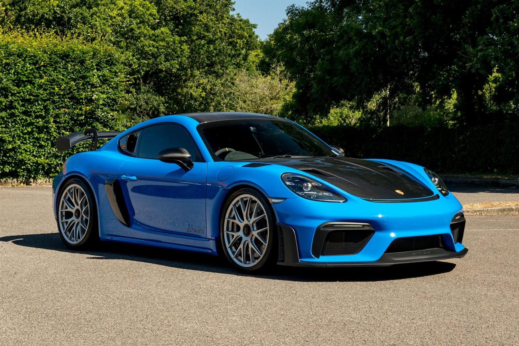 2024 '24 Plate With 3,225 Miles. Finished In Shark Blue With Black Leather/Blue Buckets. 20-inch 718 Cayman GT4 RS forged magnesium wheels, Weissach-package without roll cage, Special colours, Front axle lift system, LED headlights including Porsche Dynamic Light System Plus (PDLS Plus), BOSE® surround sound-system, Brake calipers painted in black (high-gloss), Roll cage in Deep Sea Blue, Park Assist (rear) with reversing camera And Wheels painted in Silver colour. Offered Complete With its Original Books , Including Service /Warranty Supplement, Spare keys , Tracker Fobs (Porsche Vehicle Tracking ) And Benefits From The Remainder Of Porsche Manufacture Warranty Until: 10/06/2027