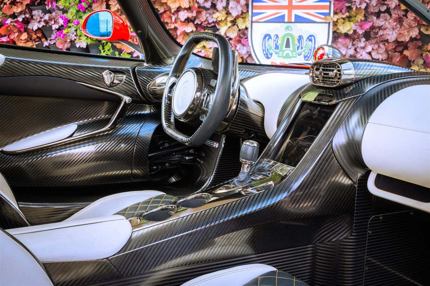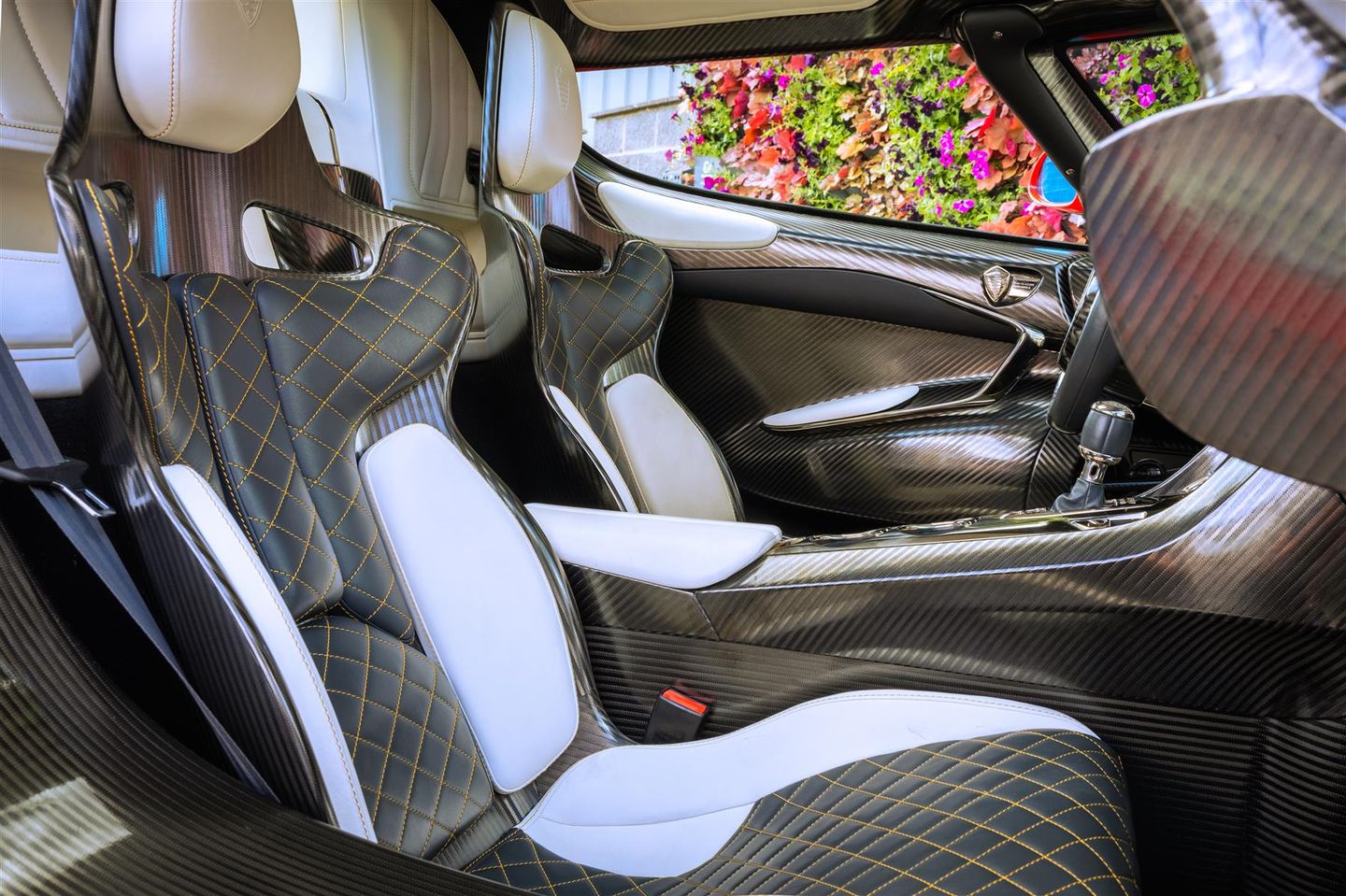 The interior of Jesko 7382 is upholstered in a striking two-tone combination of Anthracite and Snow leathers, with diamond-stitch accents, gold French stitching, and extensive carbon fibre detailing.