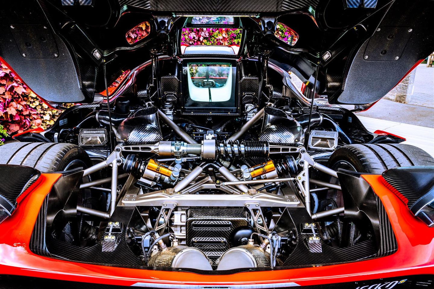 Jesko’s advanced active aerodynamics produce up to 1400 kg of downforce at high speed. It features a fully active, top-mounted twin-profile rear wing, large front splitter, front and rear underbody flaps, side winglets and rear diffusers – all designed to generate maximum grip, balance and control. Chassis 7382 includes the full track aero specification and is presented in Chilli Red with Natural Aluminium trim and Chilli Red brake calipers.