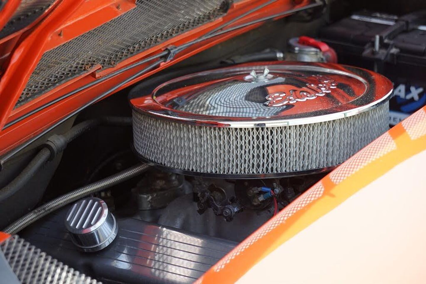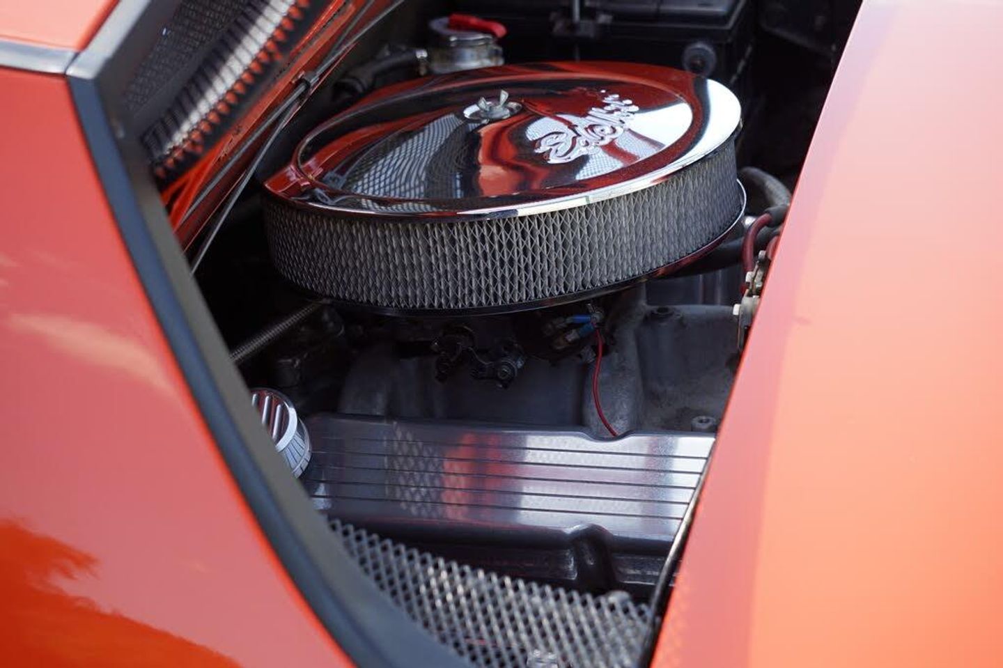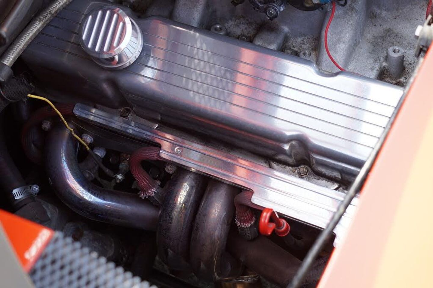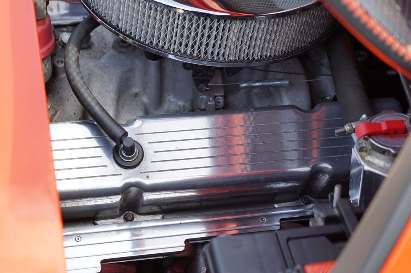 Underneath the skin this car really shines - The 350CU 5.7L V8 Engine is mated to the original 901 5 speed gearbox, and with the turn of the key fires straight into life with a roar through the custom headers and powerflow exhaust! The engine was brand new when installed in the car, and features hotter cams and electronic ignition for an estimated 400hp. Suspension has been upgraded to 914/6 suspension, along with the brakes to provide more stopping power. Many custom features were required to shoehorn the 350 into the 914, and there is a custom alloy header tank, and heavy duty water pump to keep everything cool.The car is exceptional to drive, and provides the perfect balance between power, beauty and reliability.