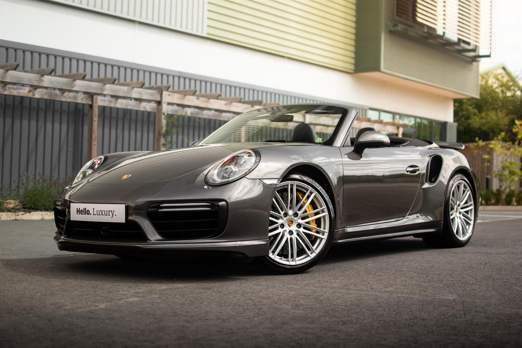 Agate Grey metallic. Black leather interior, full electric adaptive 18 way seats with lumbar support and memory function, extended leather interior package, seat backs finished in leather, heated seats, leather instrument surround, leather sun visors, extended interior package door panel in leather, heated multi-function steering wheel, exterior body coloured interior package including door trim strips, air vent slats in leather, extended interior package dashboard trim in leather, extended interior package rear in leather, belt outlet trims in leather, Racing Yellow seat belts, rear footwell lighting, floor mats, 20" 911 Turbo alloy wheels in Silver, adaptive cruise control including Porsche Active Safe, lane change assist, Porsche entry and drive, electrically folding mirrors, painted vehicle key, TV tuner, LED main headlights in black including Porsche Dynamic Light System Plus, Black powered soft top, instrument dials in Racing Yellow, Sport Chrono stopwatch instrument dial in Racing Yellow, PDK gear selector in leather. Tracker. Full Official Porsche centre / Porsche Specialist service history. 12 months warranty and roadside assistance from £695.