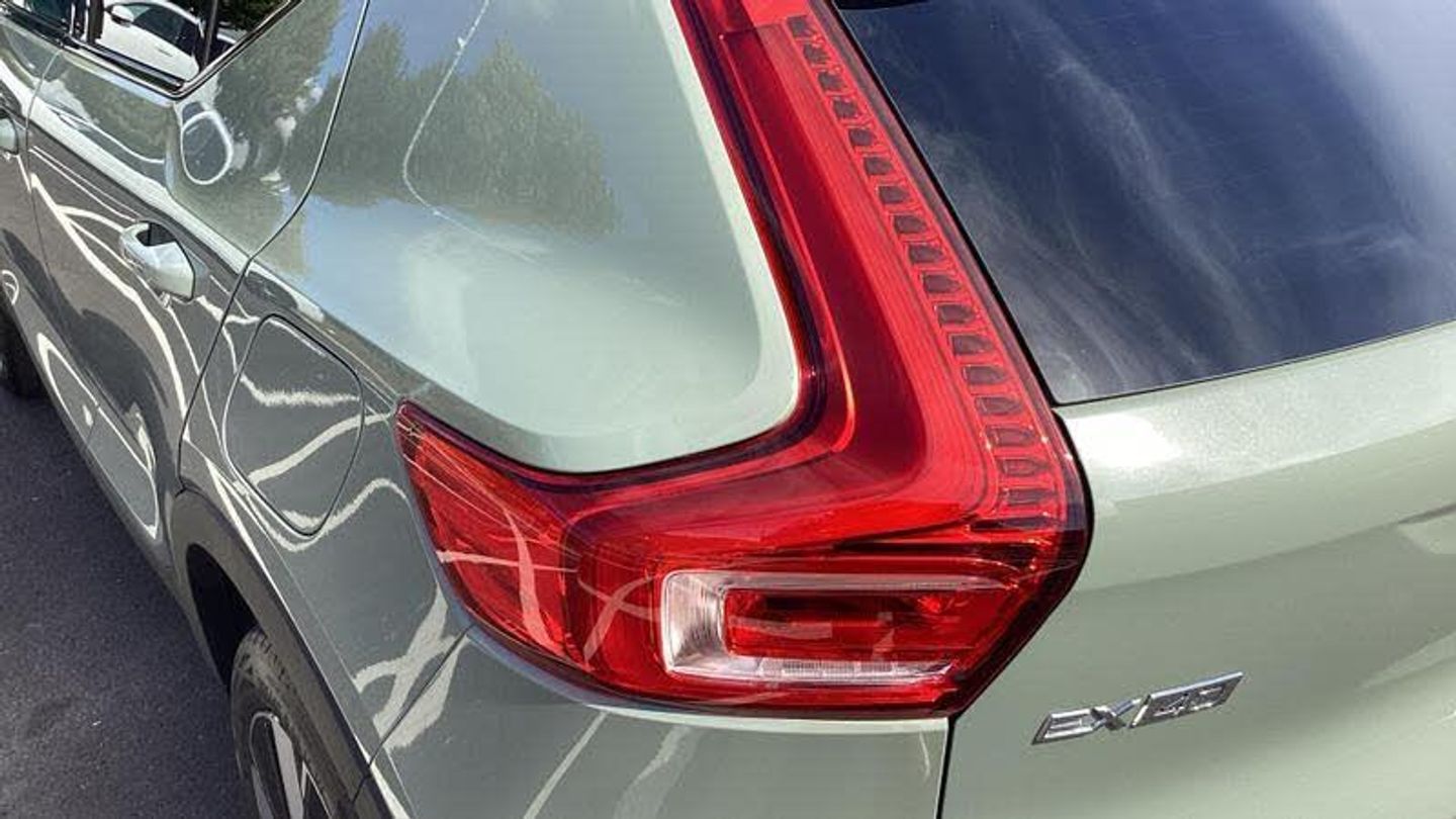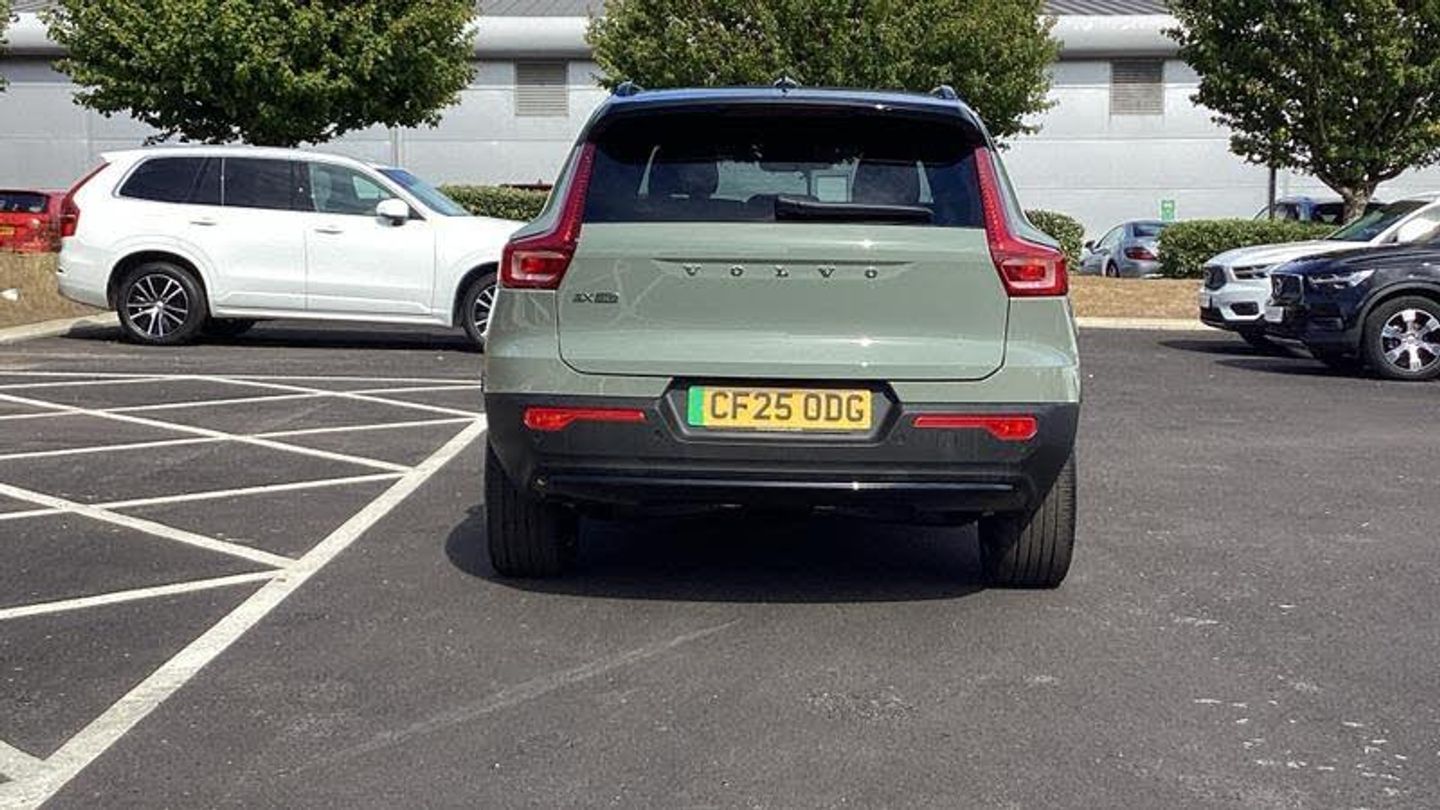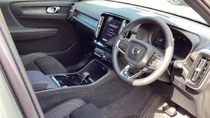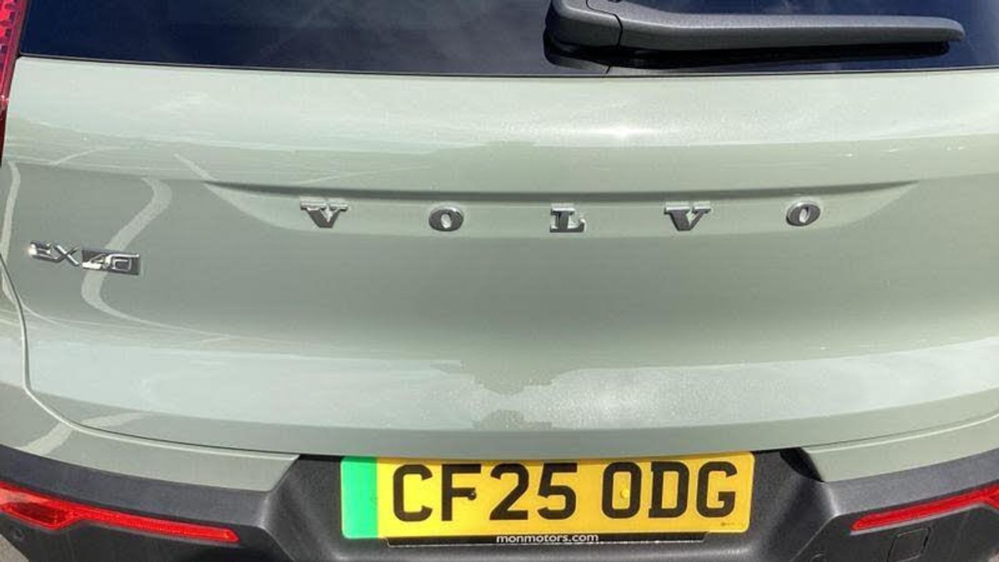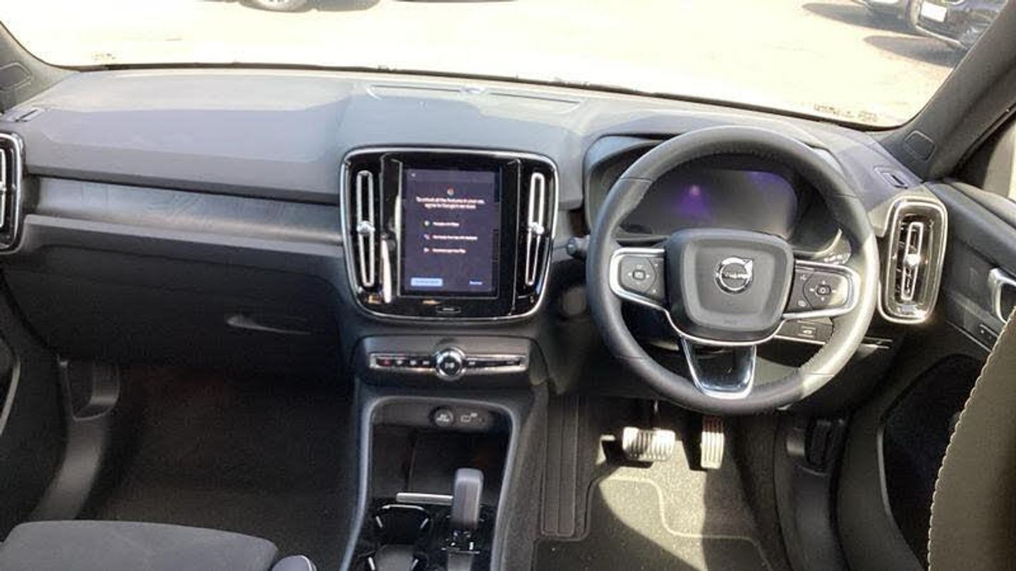 Roof top in contrast colour. Black Stone, Shift-by-wire single speed transmission, Sculpted gear shift, Afterrun parking climate, Charcoal headlining, Charcoal interior inserts, Roof top in contrast colour. Black Stone, Body coloured covered grille, Heated grill emblem, Trailer lamp control, Fog lamps, Google Assistant. Google Maps and Google Play Store - included for 4 years, Intelligent Speed Assist (ISA), High Performance audio system, Door mirror covers. high-gloss black, Small storage. front, Double locking, BLIS? and Cross Traffic Alert, Power child safety lock, Keyless entry with hands-free power tailgate, Air purifier and remote cabin pre-cleaning, Digital owners manual, Topography decor, Fixed rear head restraints, 5 seats, Mechanical release second seat row, Manual cushion extensions. driver and passenger, Power 4-way lumbar support, Sport textile interior cabin floor mats. Charcoal, Foldable load floor with cargo divider and grocery bag, i-Size/ISOFIX mounting points. front seat, Illuminated vanity mirrors, Glossy black tunnel console, Rear Collision Warning, Temporary mobility kit, Body-coloured door handles with ground lighting, Without rear engine emblem, Ticket holder, Electric cabin heater and cooler, Alcohol lock software (not available in the UK), Protective cap kit. Matt Tech Grey, 9-inch centre display, Inflatable Curtain, Steering wheel remote control, Humidity sensor, Bluetooth connection, Safety belts, [Audio and Communications]Volvo Cars App remote functions, Digital Audio Broadcasting (DAB+), Wireless phone charging, Apple CarPlay, [Drivers Assistance]Road Sign Information, Adaptive cruise control, Tyre pressure monitoring, Slippery road alert, Park assist. rear and front, Park assist camera. rear, [Exterior]Power retractable door mirrors, Automatic door locking, Tinted rear windows, Auto-dimmed rear view mirrors, 19? 5-spoke glossy black diamond cut. rear, 19? 5-spoke glossy black diamond cut, Lockable wheel bolts, High-gloss black side window trim, Roof rails. glossy black, Tempered side windows, [Illumination]LED headlights, [Interior]Two-zone climate system, Heat pump, 12.3-inch driver display, Power tailgate, Folding bag hook, Connect Suede textile/Microtech upholstery, Power driver seat with memory, Adjustable passenger seat, Heated front seats, Heated rear seats, Protection net, Rear centre armrest, Interior illumination. high level, Front centre armrest, Front load compartment, Heated steering wheel, Tailored sport steering wheel. Charcoal, EX40 aluminium front tread plates, Rain sensor, Comfort front seats, [Performance]Touring chassis, Adaptive power steering, Charging station cable. 6m, [Safety and Security]Passenger airbag cut-off switch, Dual-stage airbags, Knee airbag. driver side, Lane Keeping Aid and Lane Departure Warning, Pilot Assist, Remote key, Alarm, First-aid kit, Hill Start Assist, Oncoming Lane Mitigation, Hill Descent Control, Emergency brake light, Warning triangle, Whiplash injury protection, Side impact protection, ISOFIX mounting points. rear seat