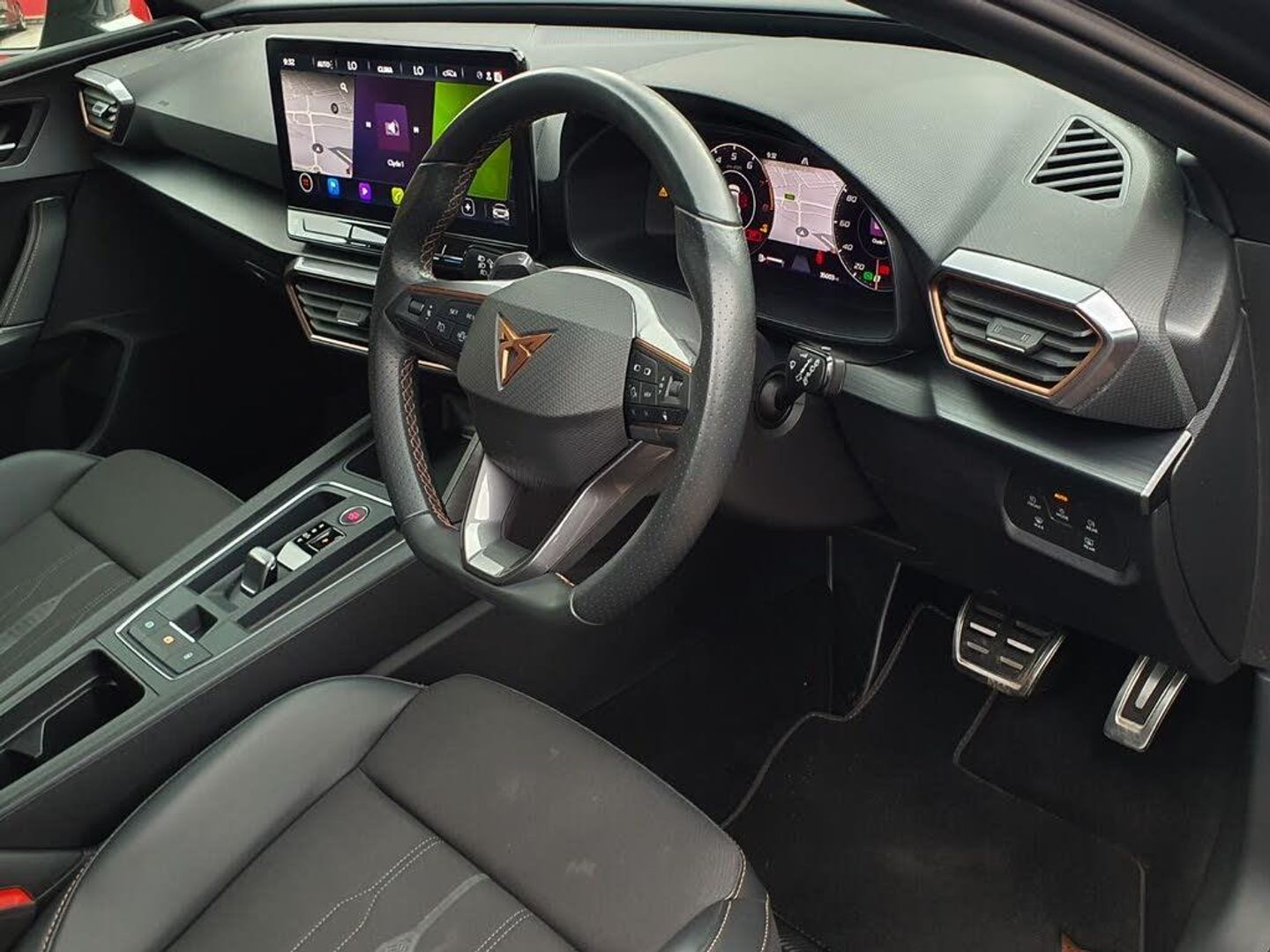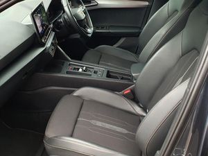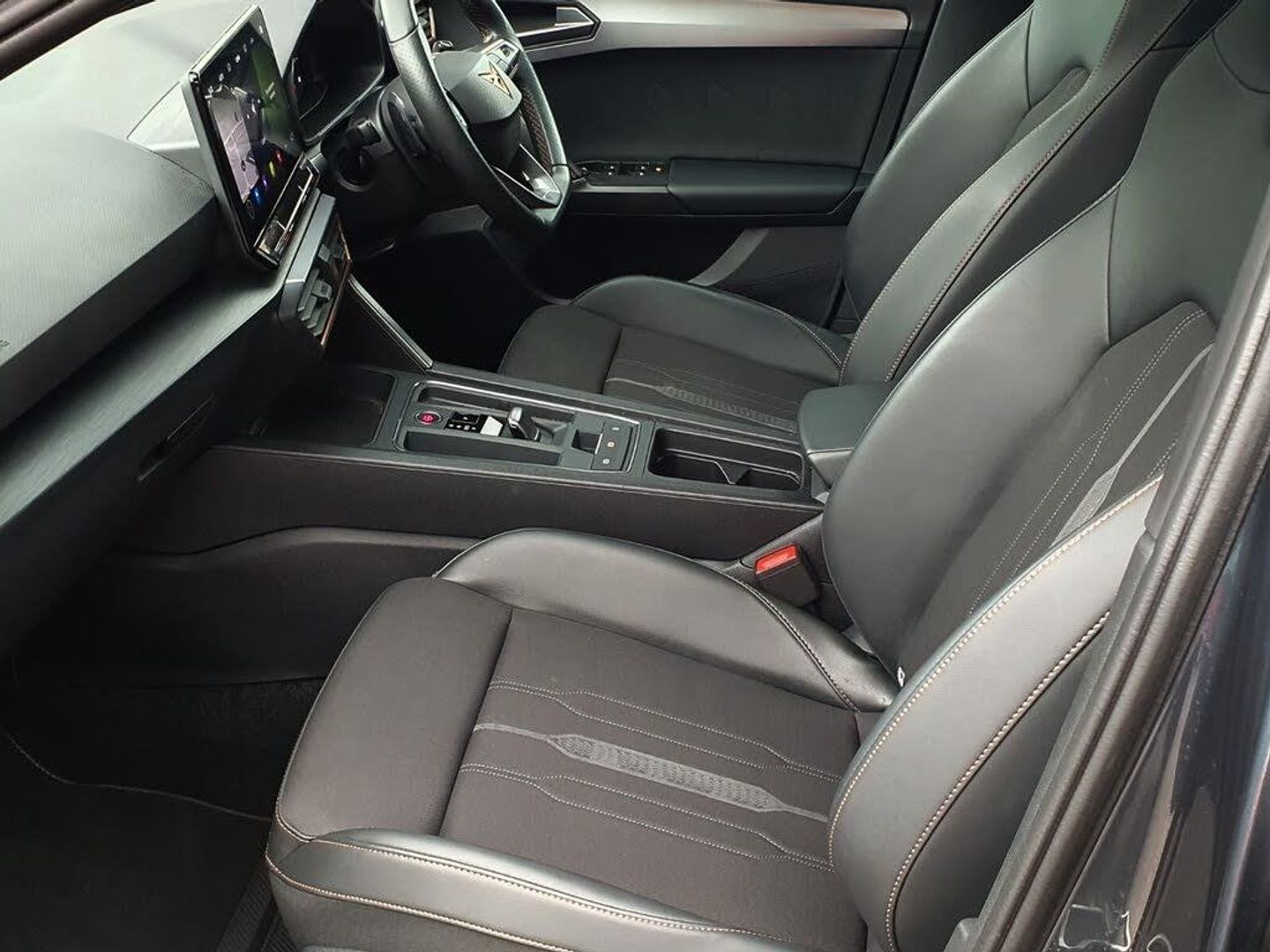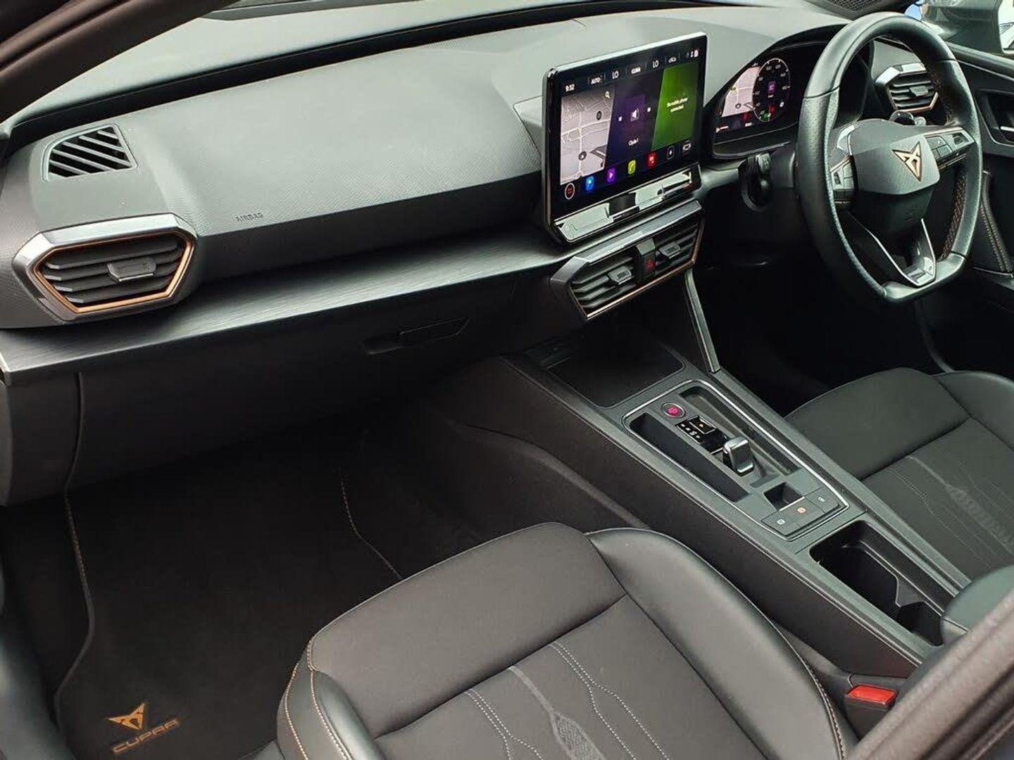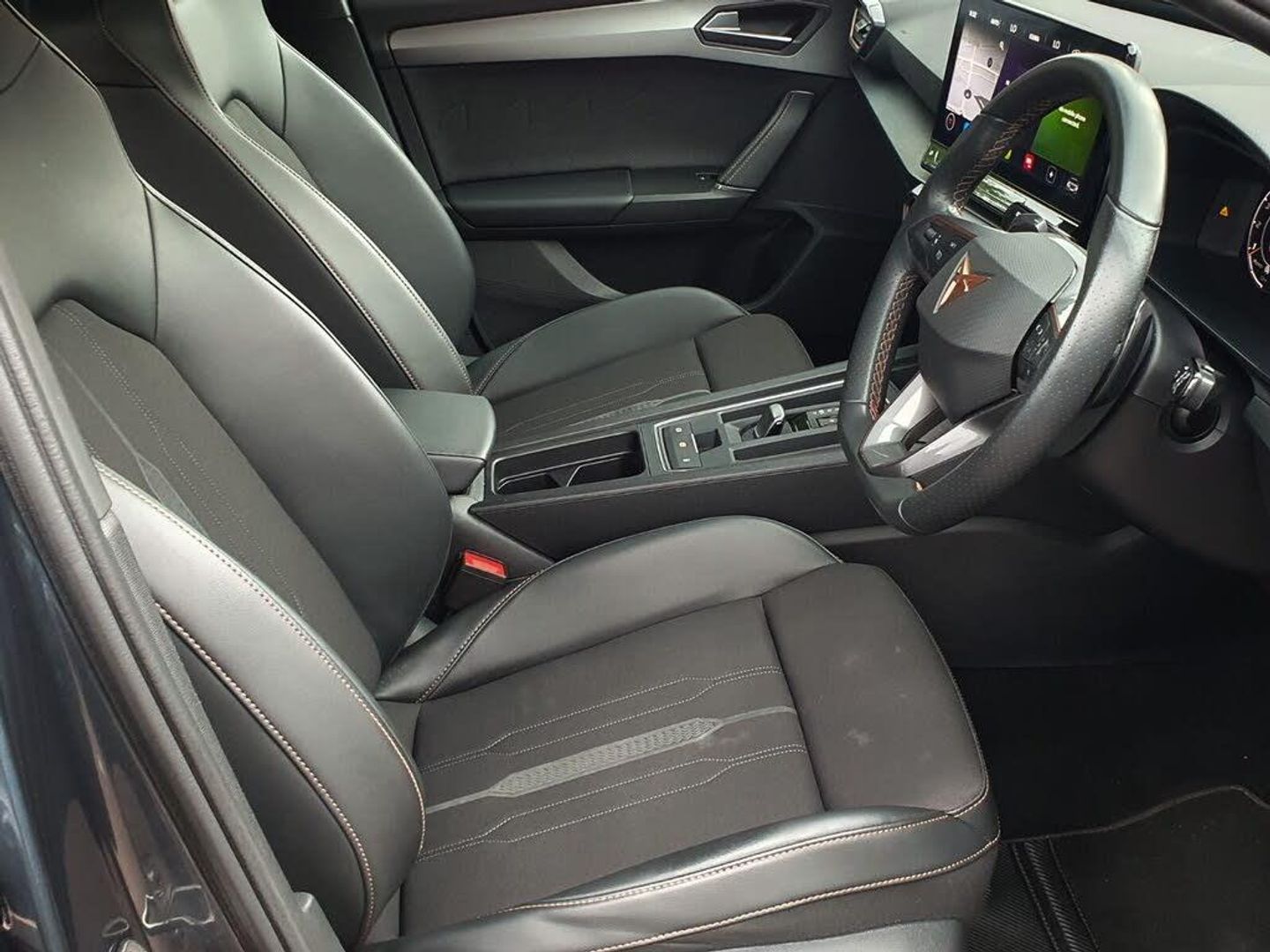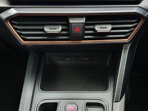 CUPRA drive profile selection with 4 modes (Comfort/Cupra/Sport/Individual), throttle response and gearshift mode, Digital cockpit, E-call, Four x USB Type C ports, Front assist with forward collision warning braking reaction to vehicles, pedestrians and cyclists, Full link smartphone integration with Mirror Link, wireless Apple CarPlay and wired Google Android Auto, Lane assist, Lockable tailgate, Park assist (inc front/rear parking sensors), Rear view camera, RPM, trip computer, outside temp gauge, instrument light brightness, low fuel warning light, lights on reminder, gearshift indicator, Service interval indicator, Start/stop system with regenerative braking, Standard suspension, XDS electronic differential lock and dynamic traction support, 7 speakers, Auxiliary input socket, Auto dimming rear view mirror, Body colour door handles, Body coloured bumpers, Cupra sports bumpers, Dark tinted rear windows, Electric front/rear windows, Electrically adjustable, heated and folding door mirrors, LED front fog lamps with cornering function, LED headlights with dynamic turn signals, tail lights, rear fog lights with rear coast to coast lighting, Rain sensing wipers, Rear diffuser with splitter and oval quad exhaust pipes, Rear side wing doors, Rear wash/wipe, Separate daytime running light with automatic headlight control and coming home feature, Third brake light, 12v power supply in centre console, 3 seat bench in 2nd row, 5 headrests, 60/40 split rear bench seat with armrest, Ambient lighting (glovebox, footwell, ambient lighting multicoloured), Black headlining, CUPRA Leather flat bottomed, heated, perforated steering and gearshift paddles, Cupra sports pedals, Driver/passenger manual seat height adjustment, Dust/pollen filter, Folding boot cover, Front and rear reading lights X 4, Front centre armrest, Front seats manual lumbar adjustment, Height/reach adjust steering wheel, Illuminated interior front door sills, Interior wraparound lighting, ISOFIX points in outer rear seats with top tether anchorage points, Jack and tool kit, Luggage tie-down hooks, PVC/Cloth upholstery with copper stitching + Cupra embossed logo on headrest, Single front passenger seat, Sports bucket seats, Storage pockets on rear of front seats, Sunvisors with illuminated mirror, Three zone climate control, Dynamic and comfort pack - Leon Cupra, Media system plus with navigation pack - Leon Cupra, 3 point seatbelts on all rear seats, ABS, Brake control system - ESC and brake booster, Child proof door locks, Cupra black brake calipers, Driver and front passenger airbags with front passenger airbag de-activation, front side and curtain airbags, Electronic parking brake, Extended safety system - seat belt tensioner, window closure and hazard lights, Hill hold control, Rear disc brakes, Seat belt reminder for front and rear seats, Tiredness recognition system, Tyre pressure monitoring system, Anti theft alarm system with interior monitoring in cab, backup horn and towing protection, KESSY Advanced - Keyless start, keyless entry, Locking wheel bolts, Chrome and copper interior detailing, 19" Machined black and silver alloy wheels with 91Y tyres, Space saver spare wheel