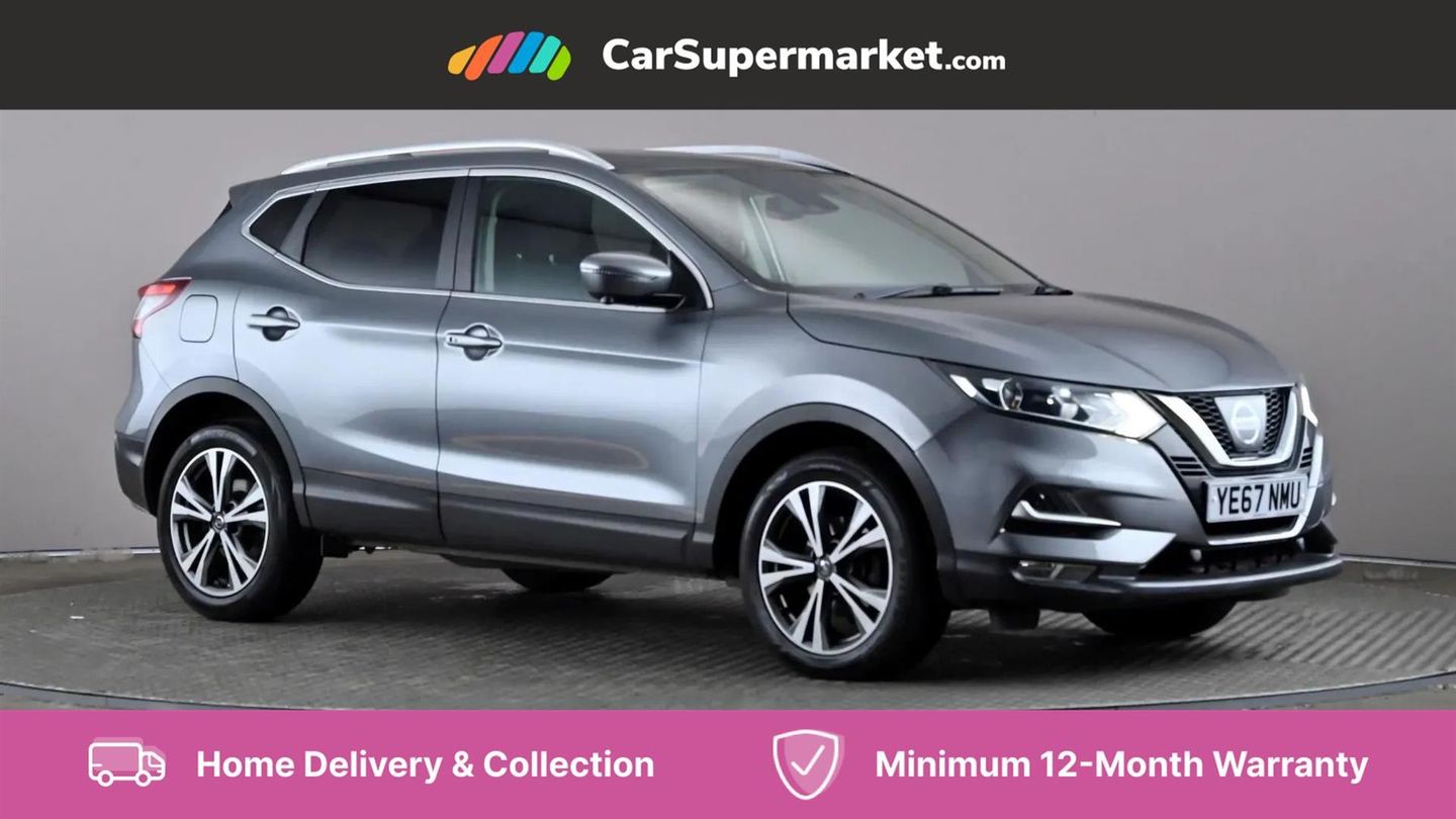 5" TFT driver information centre,Around View Monitor,Bluetooth phone integration system,Cruise control,Electric speed sensitive power steering,Front and rear parking sensors,Lane departure warning system,Nissan connect sat nav system,Outside temperature display,Push button starter,Rear view camera,Service interval indicator,Speed limiter,Traffic sign recognition,Trip computer,Diesel particulate filter,'Shark fin' mobile antenna,6 speakers,DAB Digital radio,Radio/CD,Smartphone apps,Steering wheel mounted audio controls,USB/aux input socket,Automatic headlamp activation,Body colour bumpers,Body colour door handles,Body colour door mirrors,Chrome window surround,Electric folding and heated door mirrors,High beam assist,Interior mirror with auto anti dazzle,LED indicators in door mirrors,Matt silver roof rails,One touch electric front/rear windows,Privacy glass,Rain sensor windscreen wipers,Rear roof spoiler,Rear wiper,2 X front 12v power sockets,60/40 split folding rear seat,Ambient interior lighting,Centre console with armrest,Chrome interior door handles,Cloth upholstery,Configurable luggage board system,Driver + front passenger lumbar support,Dual zone climate control,Front and rear door pockets with bottle holders,Front headrests,Front seat belt pre-tensioners with load limiters,Height adjustable driver's seat,Height adjustable passenger seat,Illuminated electric window switch,Isofix child seat preparation,Leather gearknob,Leather interior door handles,Leather knee rest,Leather steering wheel,Luggage compartment lighting,Parcel shelf,Pollen filter,Rake/reach adjustable steering wheel,Rear headrests,ABS, brake assist and EBD,Child locks on rear doors,Curtain airbags,Driver/front passenger airbag,Electronic parking brake,ESP + traction control,Forward emergency braking,Front passenger airbag deactivation,Height adjustable front seatbelts,Hill start assist,Seatbelt warning,Side airbags,Three 3 point rear seatbelts,Tyre pressure monitoring system,Alarm,Immobiliser,Intelligent Key,Remote central locking,Graphite interior trim,18" Bi-colour alloy wheels,Tyre puncture repair kit