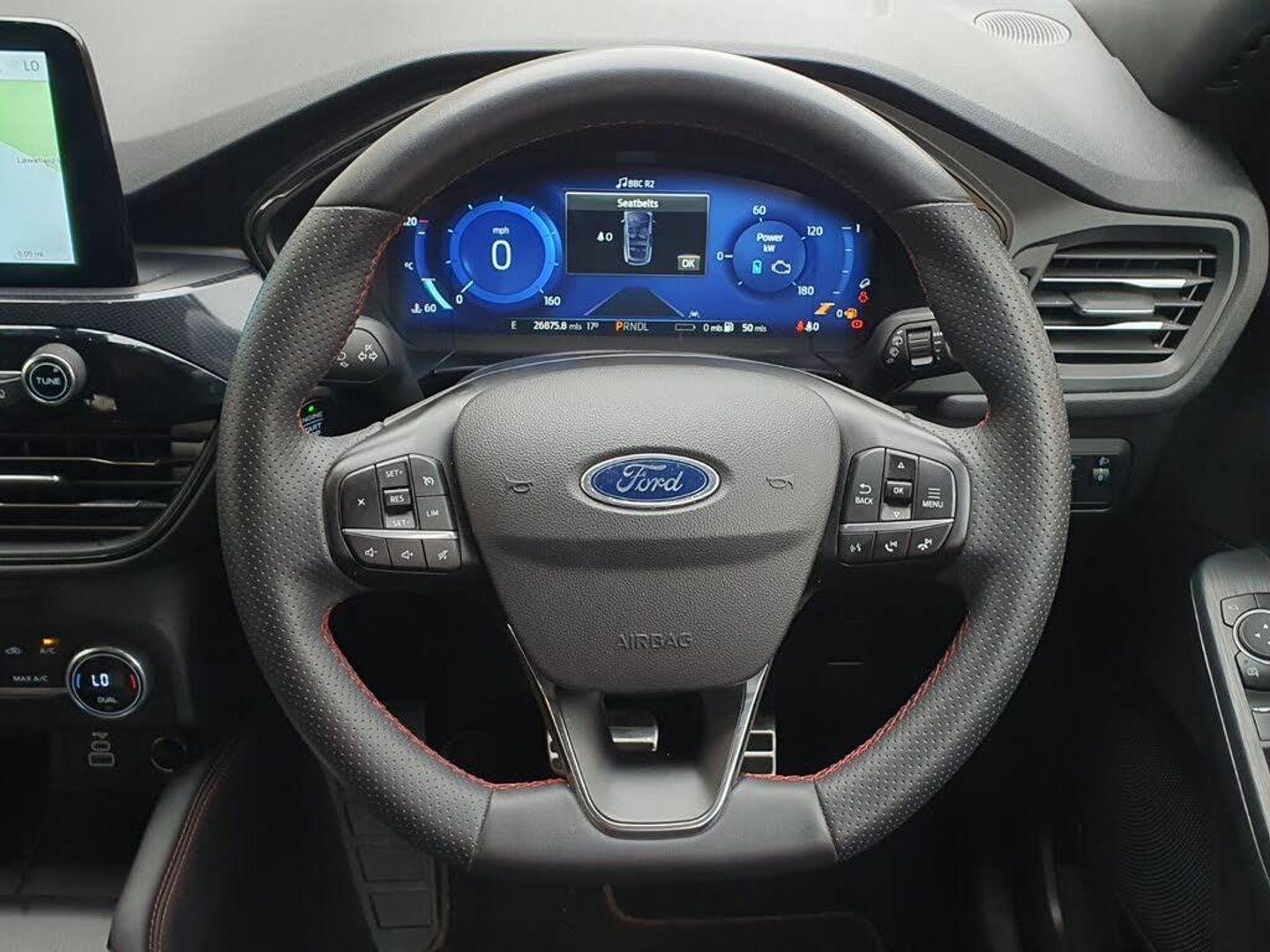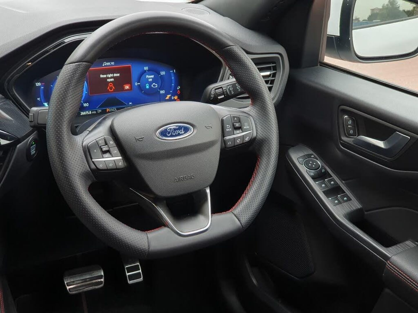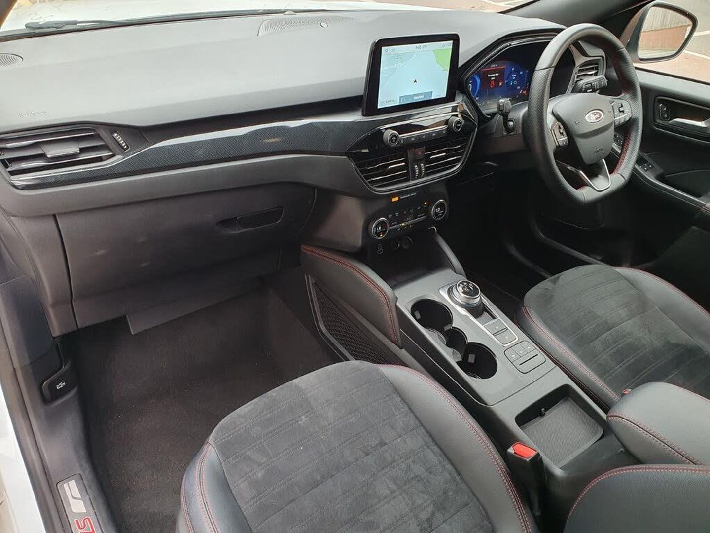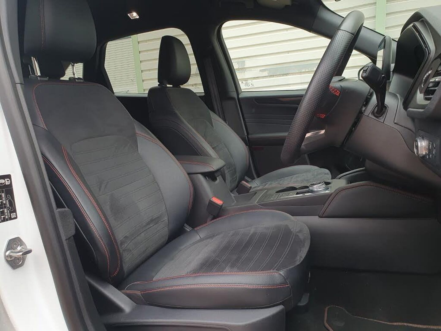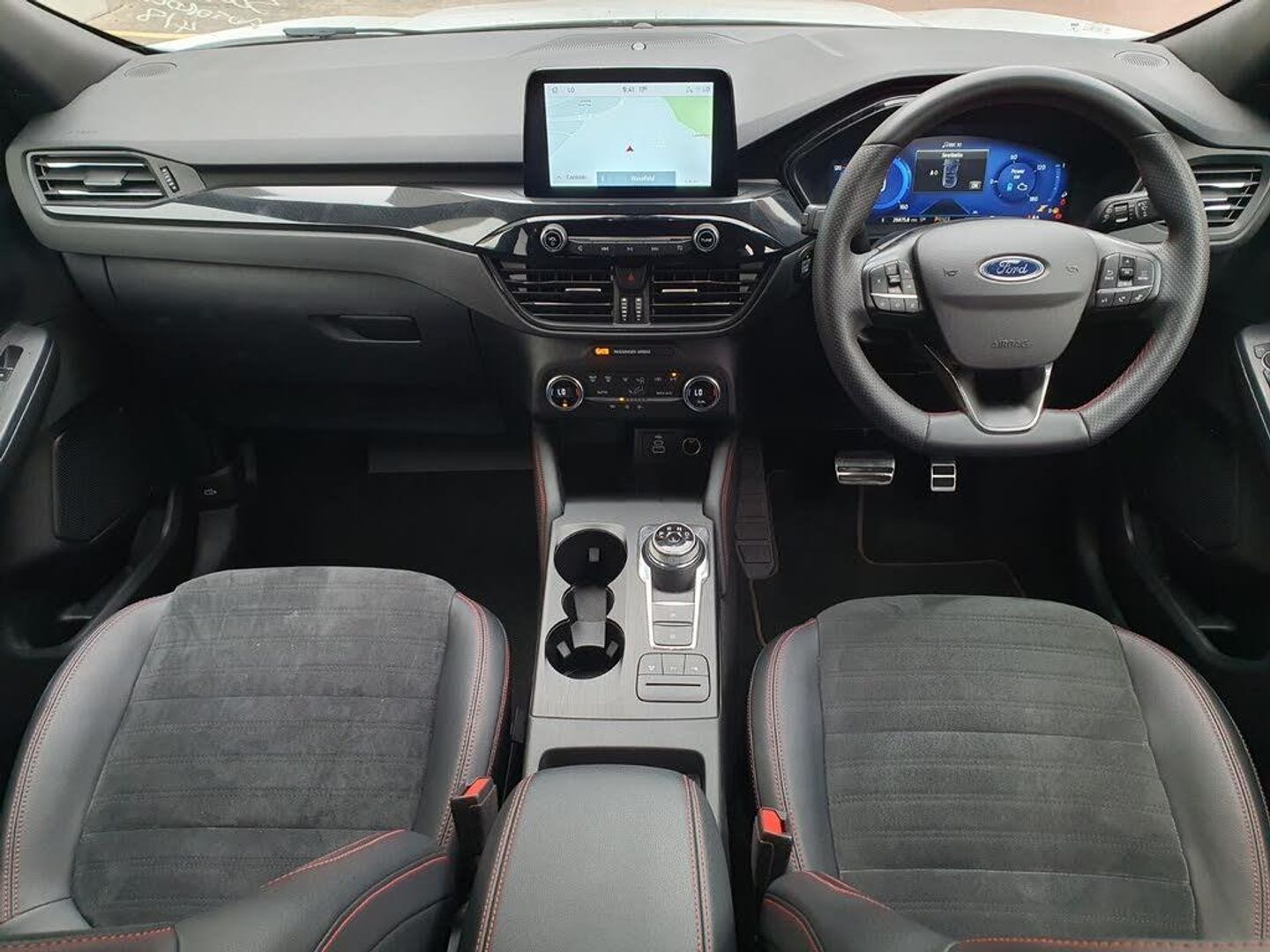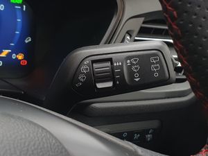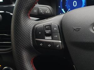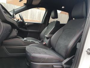 12.3" digital colour instrument cluster, Ford easy fuel, Ford SYNC 3 with 8" TFT LCD touchscreen, App Link, andriod auto/apple carPlay, emergency assistance and navigation with Ford pass connect, Front and rear parking sensors, Geo awareness, Hands free power tailgate, Lane keeping aid with lane departure warning, Power assist steering, Rear view camera, Selectable drive modes, Service interval indicator, 3-Pin Home charge cable (230V/16A Domestic socket), 3.7 kW monophase on board charger, Sports suspension, Twist beam rear suspension, B&O premium audio system with 10 speakers and subwoofer, 2 USB ports, DAB radio/CD, Auto headlamps with high and low beam, Black roof rails, Day/night rear view mirror, Front LED fog lamps, Large rear spoiler, LED daytime running lights, LED rear lights, Power folding heated door mirrors with puddle lights, Power front/rear windows with global close, Privacy glass, Quickclear heated windscreen, Rear side wing doors, Rear wiper, ST Line body styling kit with unique front and rear fascia and bumper, rear painted diffuser, front painted skid plates, dark mesh upper grille, ST Line front scuff plates, Third brake light, Twin exhausts, 10 way power adjustable drivers seat, 2nd row sliding seats with 60:40 split, 8 way manual passenger seat including lumbar support and height adjust, Alloy pedals, Centre console with electronic parking brake, Dark headlining and pillars, Dual electronic automatic temperature control, Flat bottomed leather steering wheel in sensico with red stitching, Front and rear head restraints, Partial premium touch sensico leather upholstery with black cloth inserts and red stitching, Rear charging point, Single front passenger seat, Sports seats, ST Line front and rear floor mats, 3x3 point rear seatbelts, Airbags - front driver/passenger, front and rear curtain, Drivers knee airbag, Electronic stability control (ESC) and ABS, Ford MyKey Gen 2 safety system, Manual child proof rear door locks, Post collision braking, Pre collision assist with autonomous emergency braking, Rear seat Occupancy alert, Red brake calipers, Tyre pressure monitoring system, Engine immobiliser, Keyless entry and Ford power start button, Locking wheel nuts, Remote powered central double locking doors, Thatcham category 1 alarm