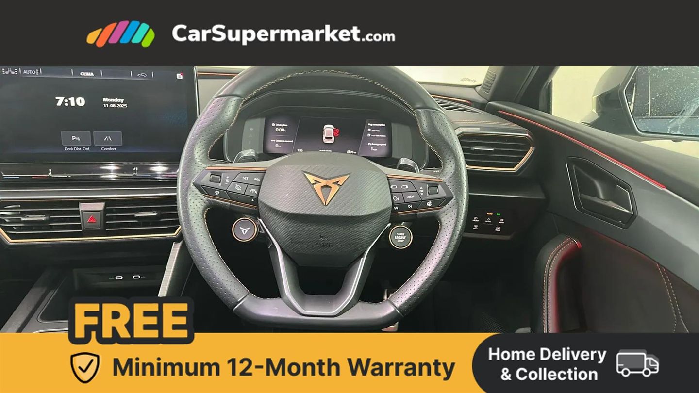 Digital Cockpit, Apple CarPlay, Android Auto, Wireless Phone Charging, Parking Sensors, Heated Steering Wheel, Heated Front Seats, Sat Nav, Keyless Entry, 19" Alloy Wheels;This 2023 CUPRA Leon eHybrid VZ3 boasts a full service history, with its last service completed on 18th July 2025 at 18,843 miles, and its MOT remains valid until November 2026, offering excellent peace of mind. This Euro 6 compliant plug in hybrid features a 1.4 litre petrol engine and is presented with a clear vehicle history check. Inside, you'll find a host of desirable features designed for comfort and convenience, including heated front seats, a powered driver's seat with memory function, and a manual height adjustment for the passenger seat. Enjoy a comfortable cabin environment with three zone climate control, and stay connected and powered up with the integrated wireless phone charger. Parking is made easier with the helpful rear view camera.
