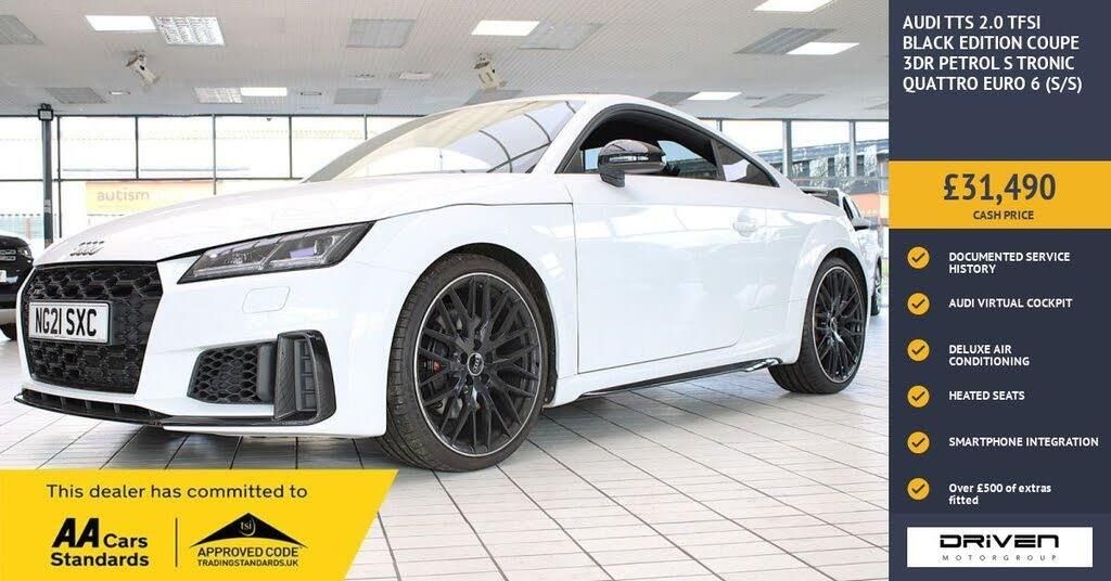 AUDI TTS 2.0 TFSI BLACK EDITION COUPE 3DR PETROL S TRONIC QUATTRO FINISHED IN IBIS WHITE AND COMPLIMENTED WITH ALCANTARA PART LEATHER INTERIOR, THIS VEHICLE HAS BEEN VERY WELL CARED FOR AND MAINTAINED WITH DOCUMENTED SERVICES AT 6776, 11403, 15423 MILES PLUS COMPREHENSIVE PRE DELIVERY HEALTH CHECK AND SERVICE COMPLETED PRIOR TO SALE AT 23255 MILES. KEY FEATURES INCLUDE ALLOY WHEELS, ALARM, SMARTPHONE INTEGRATION, AUDI SOUND SYSTEM, AUDI VIRTUAL COCKPIT, AUTO DIMMING REAR VIEW MIRROR, BLUETOOTH, CRUISE CONTROL, DAB RADIO, DELUXE AIR CONDITIONING, ELECTRIC FOLDING DOOR MIRRORS, HEATED SEATS, KEYLESS GO, RAIN SENSITIVE WIPERS, MII RADIO, PRIVACY GLASS, REAR PARKING SENSORS PLUS MUCH MORE. COMMITTED TO AA CARS STANDARDS: 3 MONTHS OR 3000 MILES WARRANTY INCLUDED WITH AN OPTION TO UPGRADE: 12 MONTHS AA BREAKDOWN RECOVERY INCLUDED: £75.00 CONTRIBUTION TOWARDS YOUR NEXT SERVICE/MOT AT ANY AA CARS STANDARD APPROVED WORKSHOP: WE STAND BY THE QUALITY OF OUR VEHICLES. WITH THE PURCHASE OF THIS VEHICLE, YOU WILL RECEIVE 3 MONTHS OR 3000 WARRANTY, 12 MONTHS AA BREAKDOWN RECOVERY, GIVING YOU ADDITIONAL PEACE OF MIND AND PROTECTION. ALL OUR CARS COME WITH AT LEAST 6 MONTHS MOT AND PRE SALE HEALTH CHECK AND ROAD TEST. OUR PROFESSIONAL TEAM ENSURES YOUR VEHICLE STAYS IN TOP CONDITION, AND YOU ENJOY A HASSLE-FREE OWNERSHIP EXPERIENCE. 4.6 STARS ON GOOGLE WITH OVER 550 REVIEWS: JOIN OUR COMMUNITY OF SATISFIED CUSTOMERS! OUR DEALERSHIP IS PROUD TO HAVE A 4.6 STAR RATING ON GOOGLE, BACKED BY OVER 550 POSITIVE REVIEWS. WE ARE COMMITTED TO PROVIDING EXCELLENT SERVICE AND HIGH-QUALITY VEHICLES. This Vehicle Comes Equipped with High Specification, Which Includes: - Drive this car home with complete confidence and satisfaction: All cars proudly offered by driven group are rigorously inspected, hpi checked and prepared to the highest standard To drive this car home, visit www.drivegroup.co.uk or call 01642-601999 to arrange an appointment with our sales team Please note we do not operate an organised distance selling scheme as defined by the consumer contracts (cancellation, information and additional charges) regulations 2013. Therefore, even if you choose to not view your vehicle at our premises prior to purchase,you will not be entitled to cancel your order under any 14 day cancellation period. All other statutory rights remain unaffected. Whilst every effort has been made to ensure the accuracy of the information contained in this website, please check with us about any item which may affect your decision to purchase. Driven motor group shall not be liable for any errors, inaccuracies or delays in content.